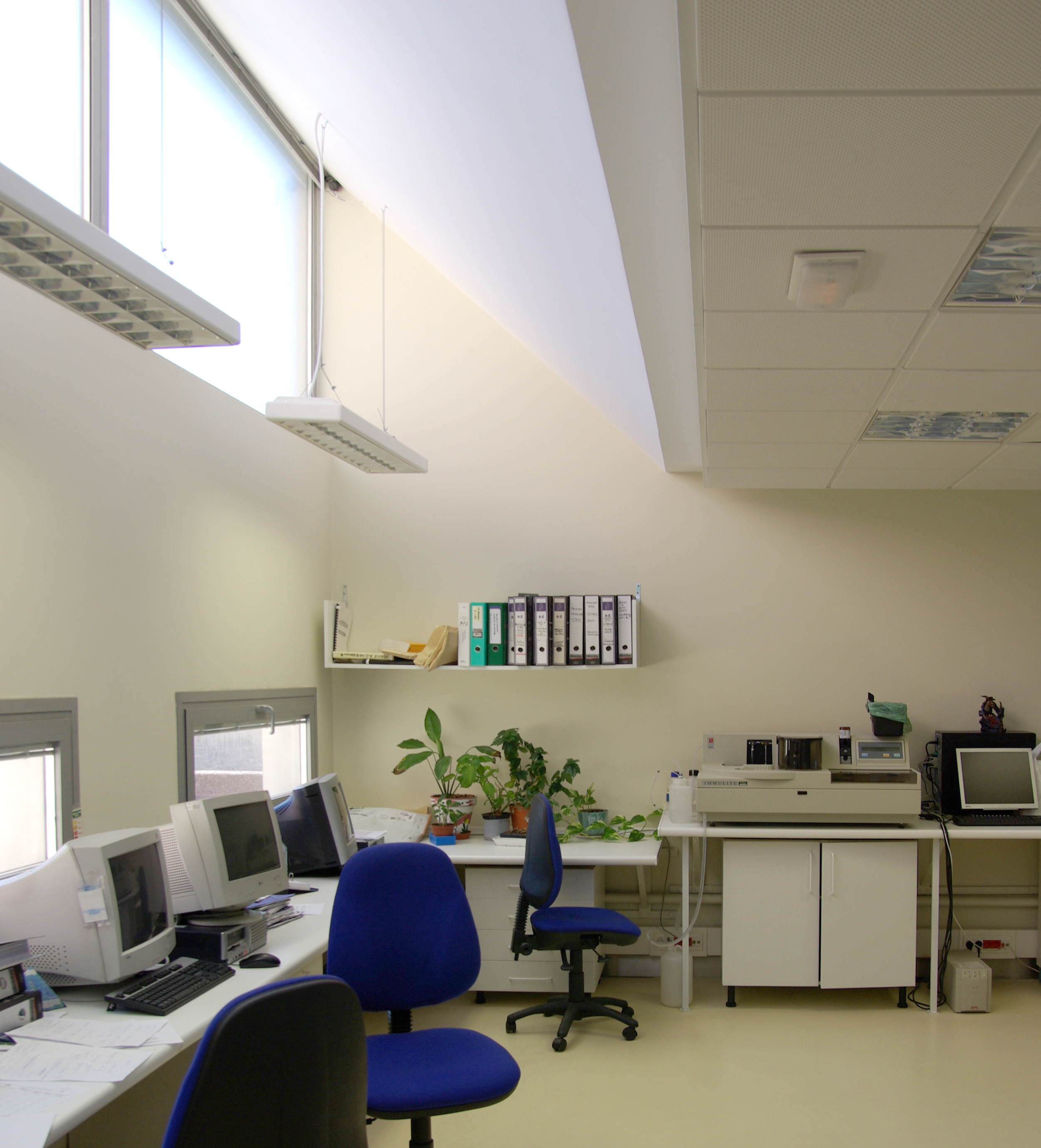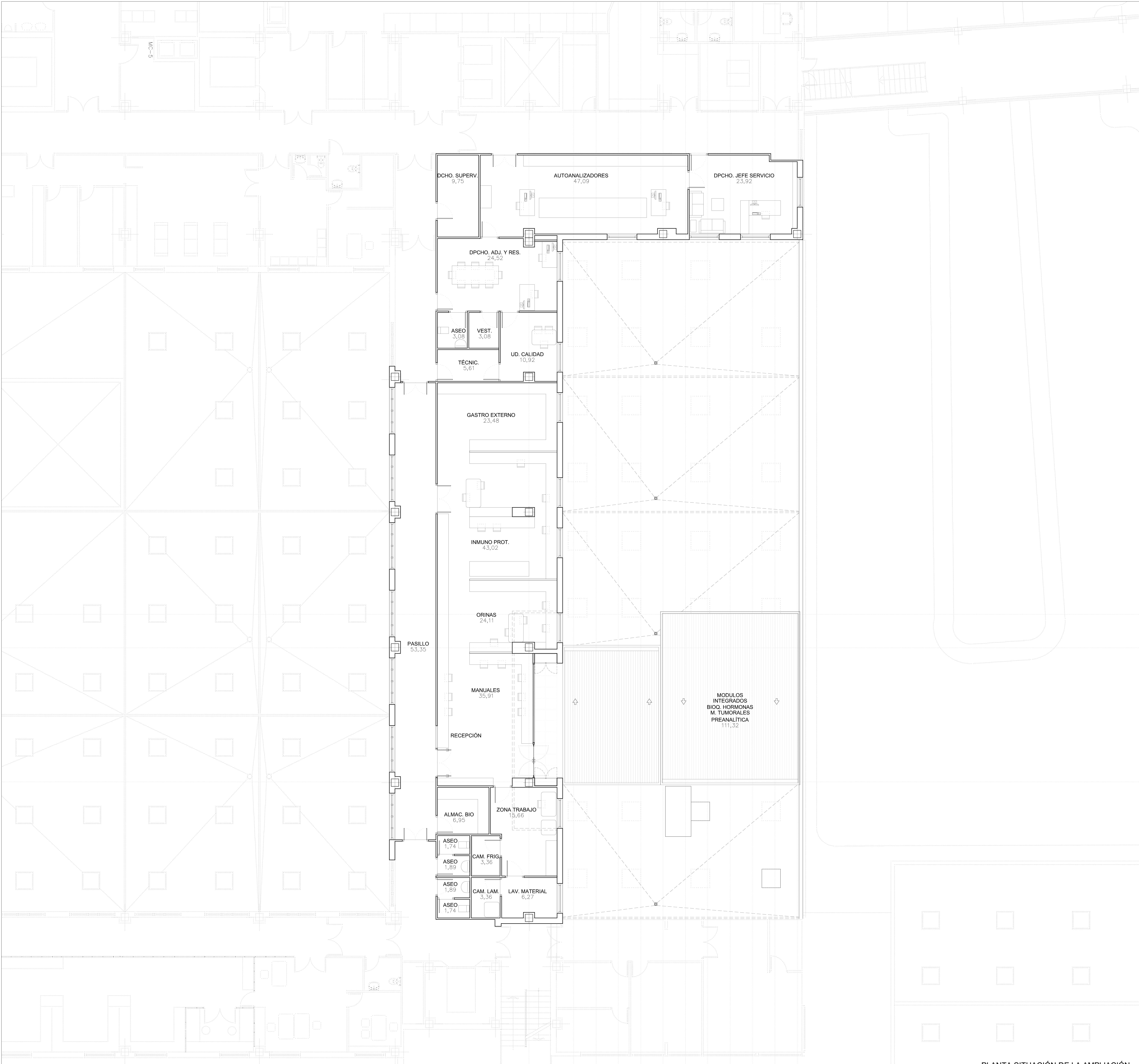 La ampliación servirá para alojar en su interior una máquina modular de preanalítica, que requiere un espacio diáfano con puestos de trabajo a su alrededor, y con conexión al laboratorio existente a través de una puerta doble que permita una climatización independiente.