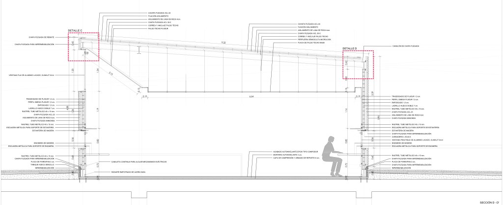 Toda la construcción se resuelve con materiales sencillos y de fácil y rápido montaje, estructura de perfiles laminados de acero, y cerramiento de paneles de chapa metálica galvanizada con aislamiento intermedio formando un sistema tipo “sandwich” incluso en la cubierta.