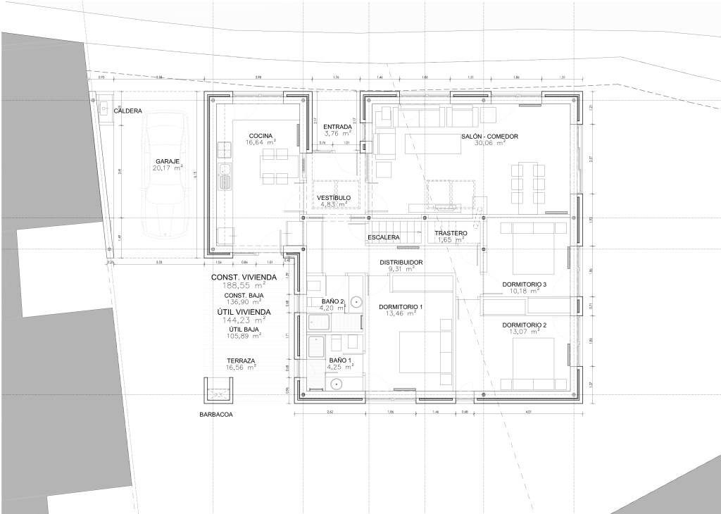La vivienda se resuelve con un sencillo gesto de la cubierta que va envolviendo los distintos espacios, dejando a la zona de la calle la menor altura, elevándose de forma discreta un poco más atrás para conseguir la buhardilla. La edificación se alinea sensiblemente con el frente a la calle en su zona más recta, buscando así las orientaciones intermedias, más benevolentes en Mozoncillo.