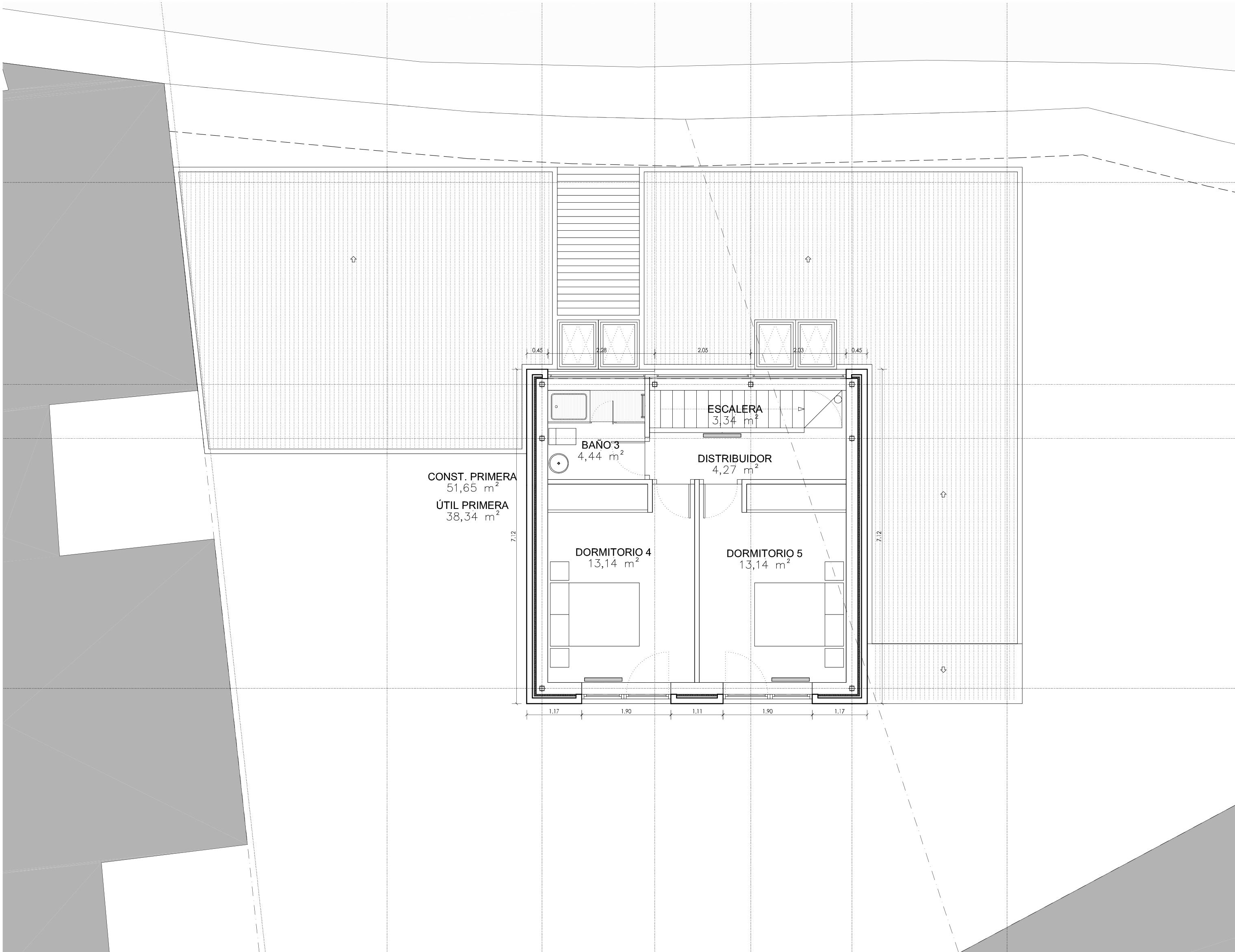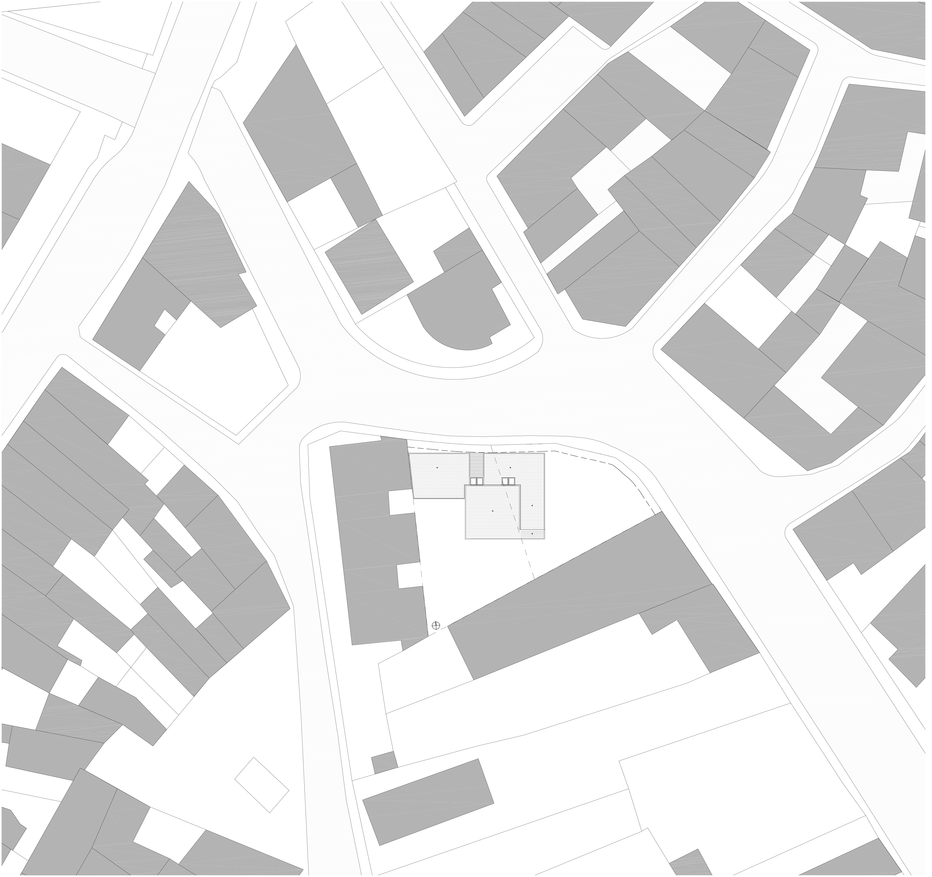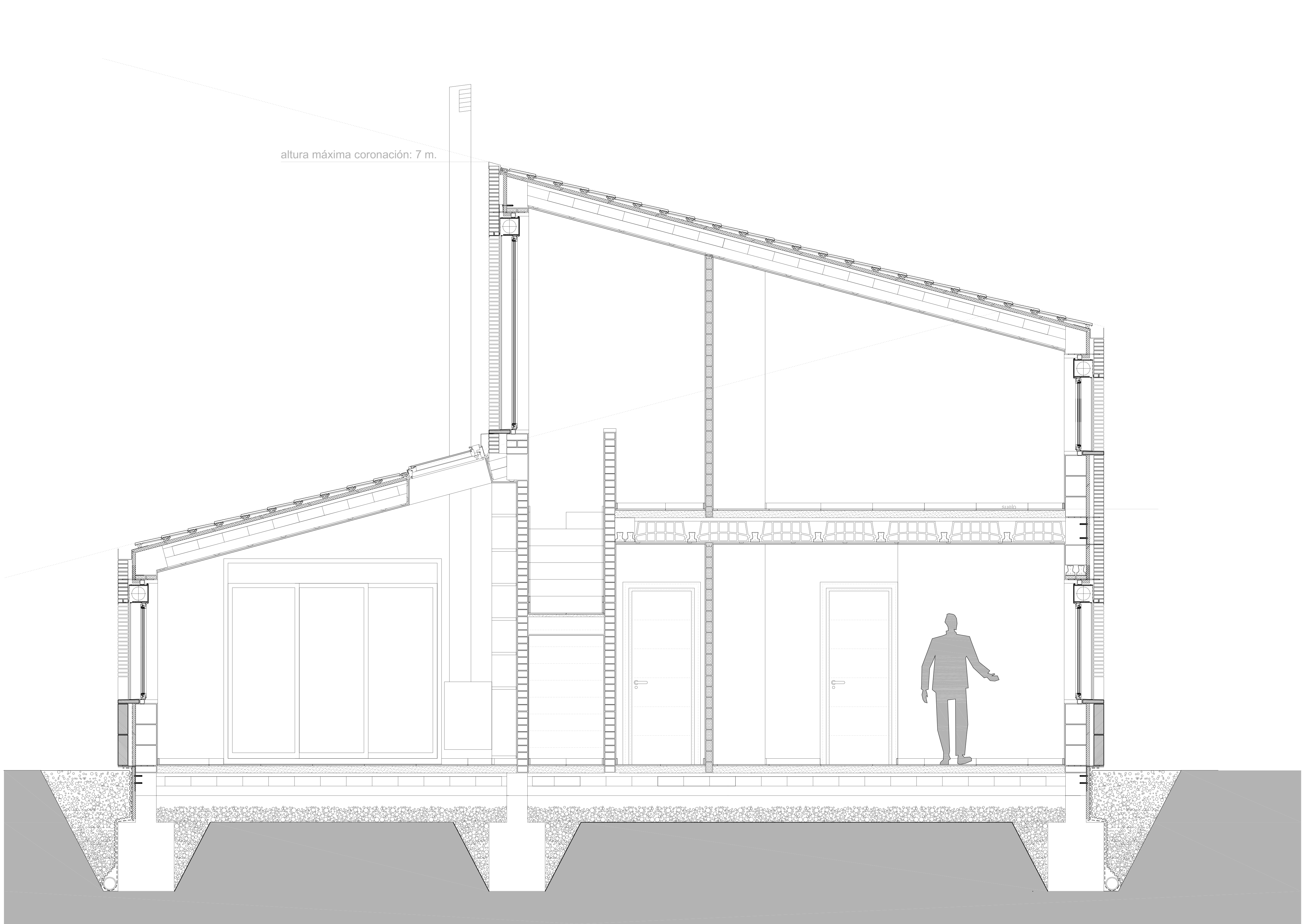 La vivienda se resuelve con un sencillo gesto de la cubierta que va envolviendo los distintos espacios, dejando a la zona de la calle la menor altura, elevándose de forma discreta un poco más atrás para conseguir la buhardilla. La edificación se alinea sensiblemente con el frente a la calle en su zona más recta, buscando así las orientaciones intermedias, más benevolentes en Mozoncillo.