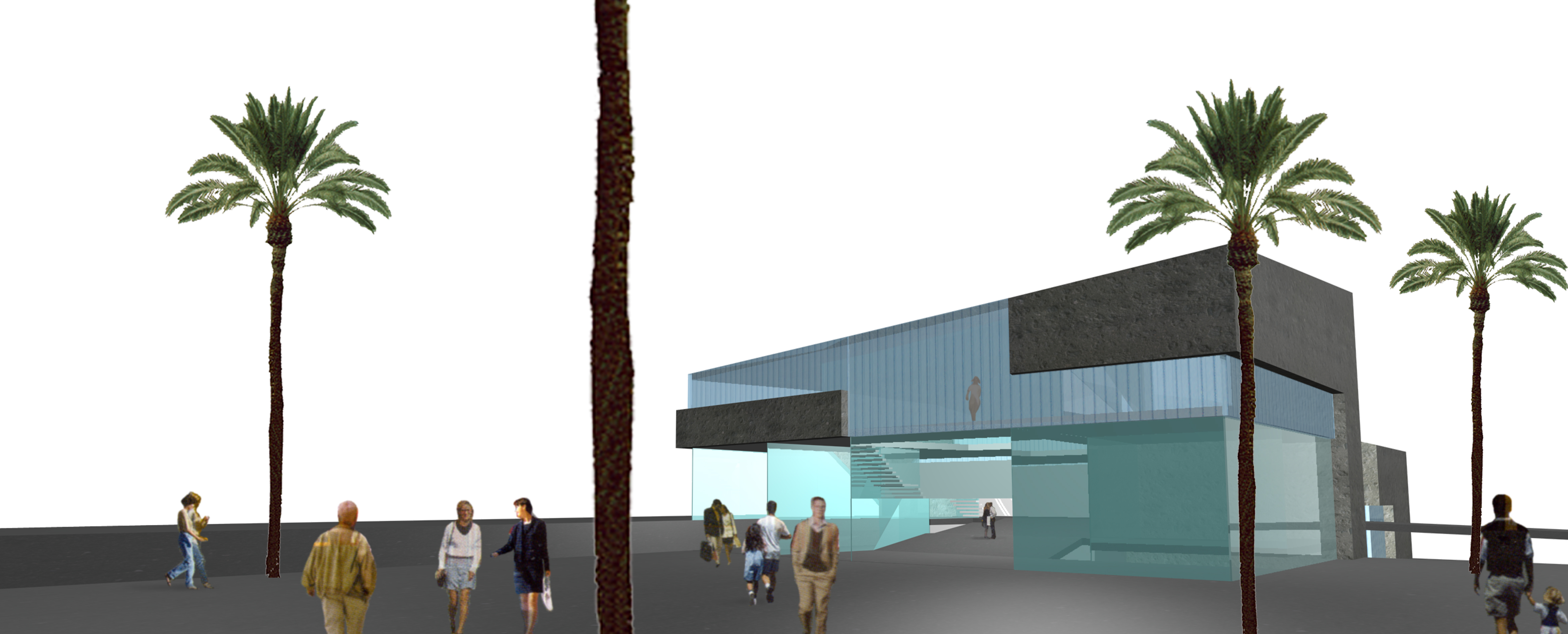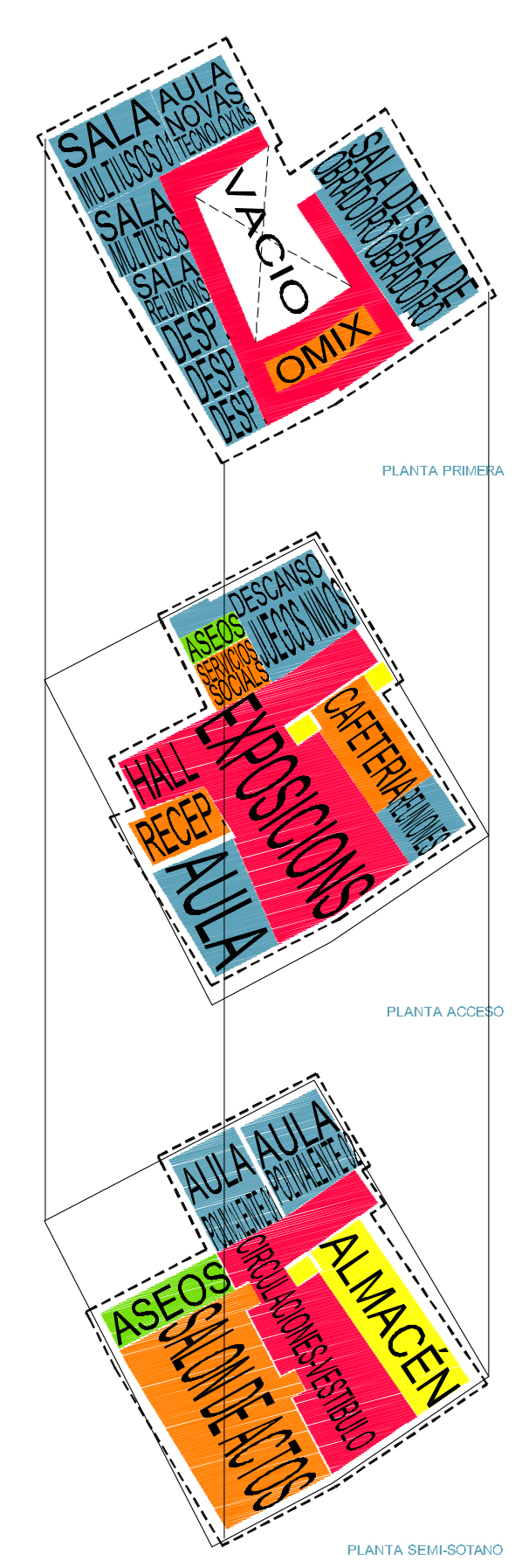 Esta configuración deja un atrio central, que funciona como distribuidor general del edificio, una especie de plaza interior a doble altura, que permite atravesar el edificio de forma intuitiva en las tres direcciones principales mencionadas anteriormente: de la calle a la plaza, de la plaza al paseo marítimo y del Paseo Marítimo a la calle. Esta cualidad de catalizador de movimientos, hace que el edificio refuerce su carácter público, convirtiendo su centro geométrico en el centro de gravedad de las actividades que se desarrollan en su entorno.