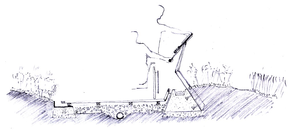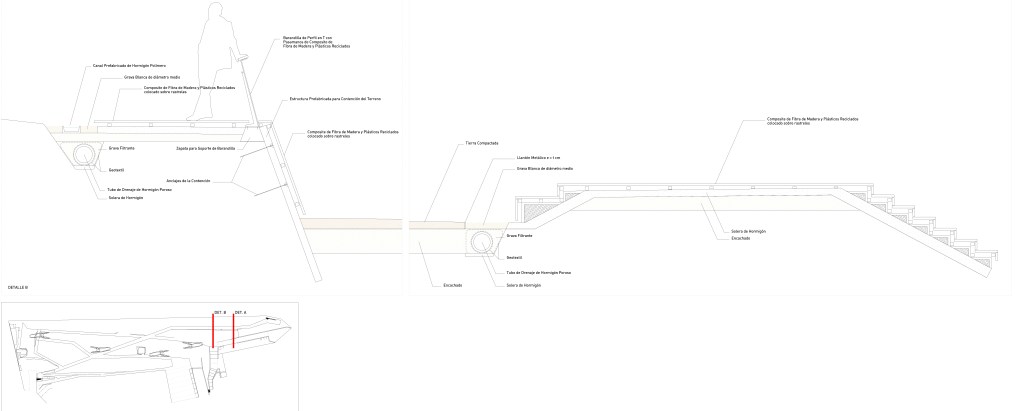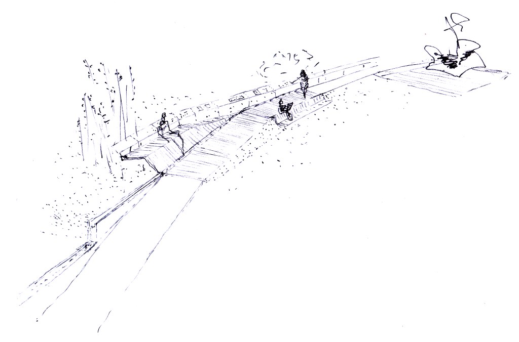 Con la misma intención, un cauce de agua sigue el mismo recorrido que los caminos principales, produciendo un leve ronroneo que acompaña al paseante. En los cambios de cota, a modo de señalización acústica, el reguero se transforma en un pequeño salto de agua, advirtiendo de la presencia de una rampa.
