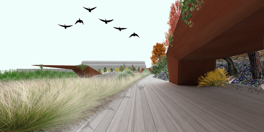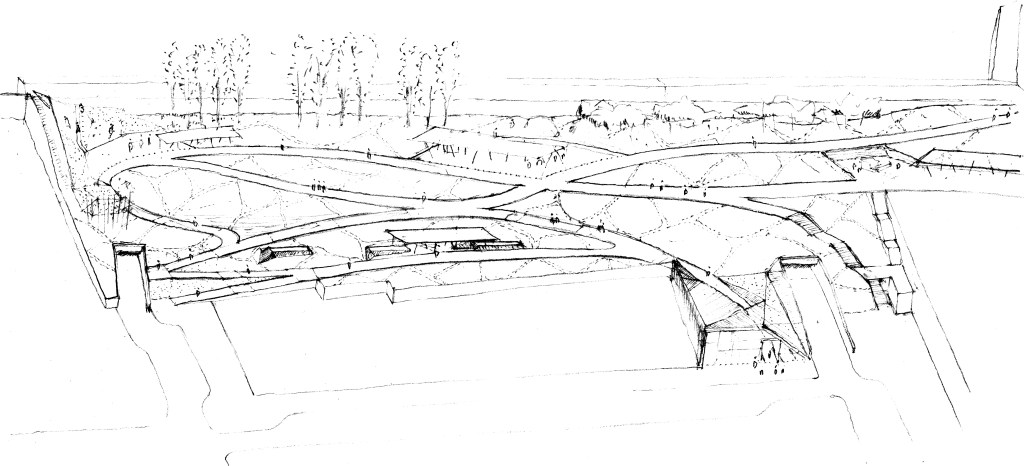 Las zonas de plantación entre caminos se resuelven en forma de pequeñas lomas, para aproximar lo plantado a la mano del paseante (tacto) y para reducir la carga sobre la estructura existente del aparcamiento subterráneo. Dentro de las zonas de plantación entre caminos principales, aparecen unos senderos de servicio para el mantenimiento de los parterres.