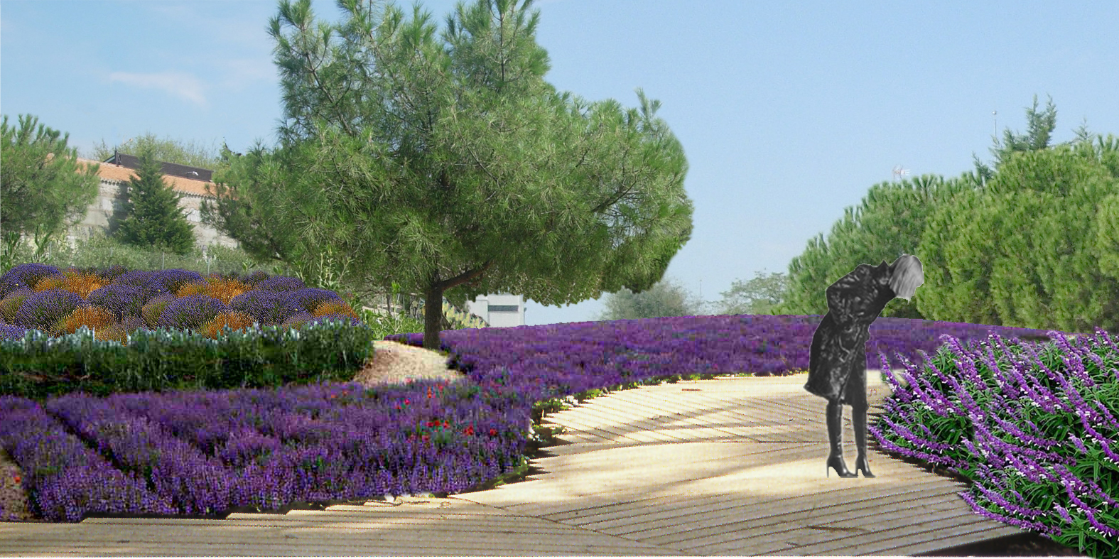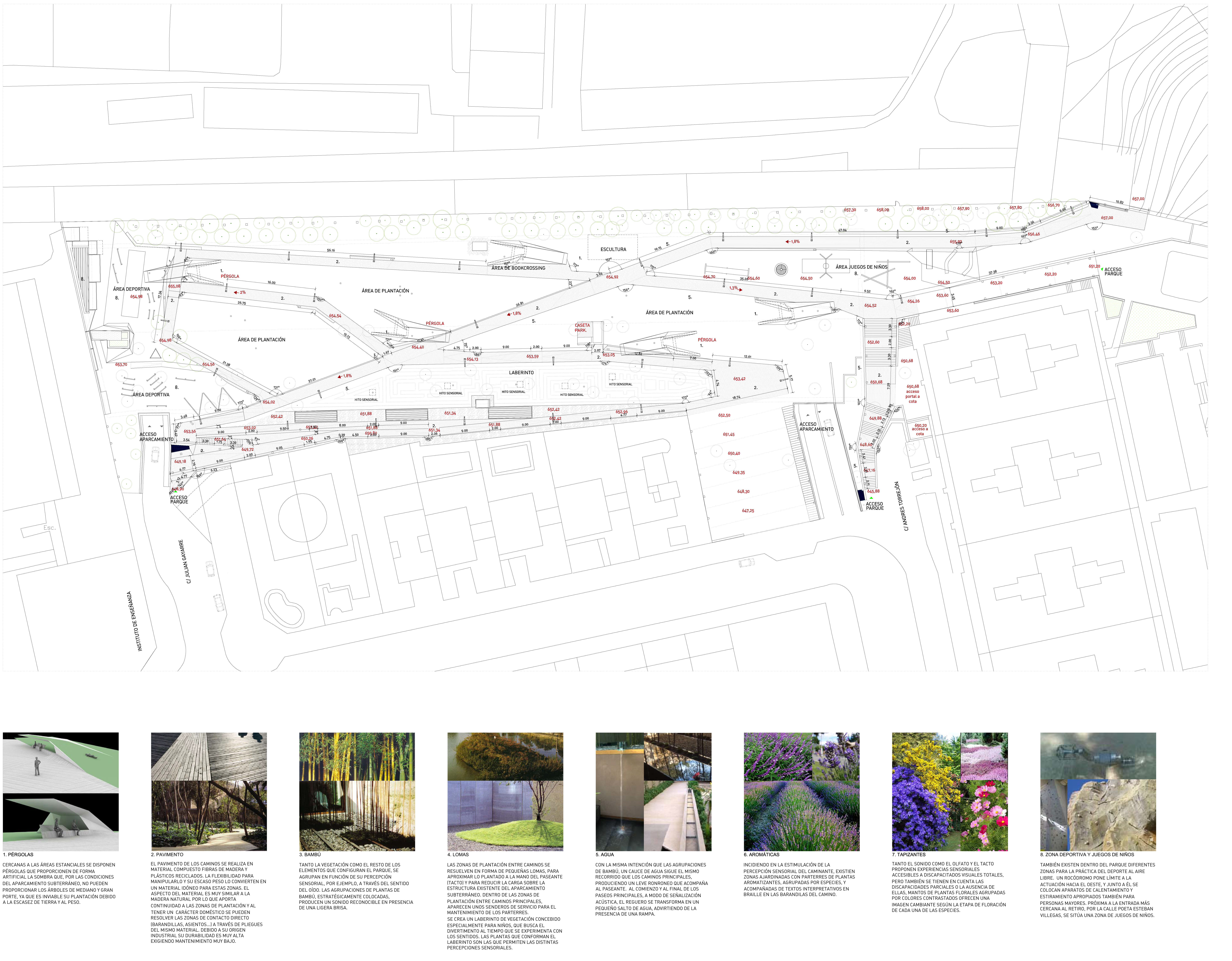 Las zonas de plantación entre caminos se resuelven en forma de pequeñas lomas, para aproximar lo plantado a la mano del paseante (tacto) y para reducir la carga sobre la estructura existente del aparcamiento subterráneo. Dentro de las zonas de plantación entre caminos principales, aparecen unos senderos de servicio para el mantenimiento de los parterres.