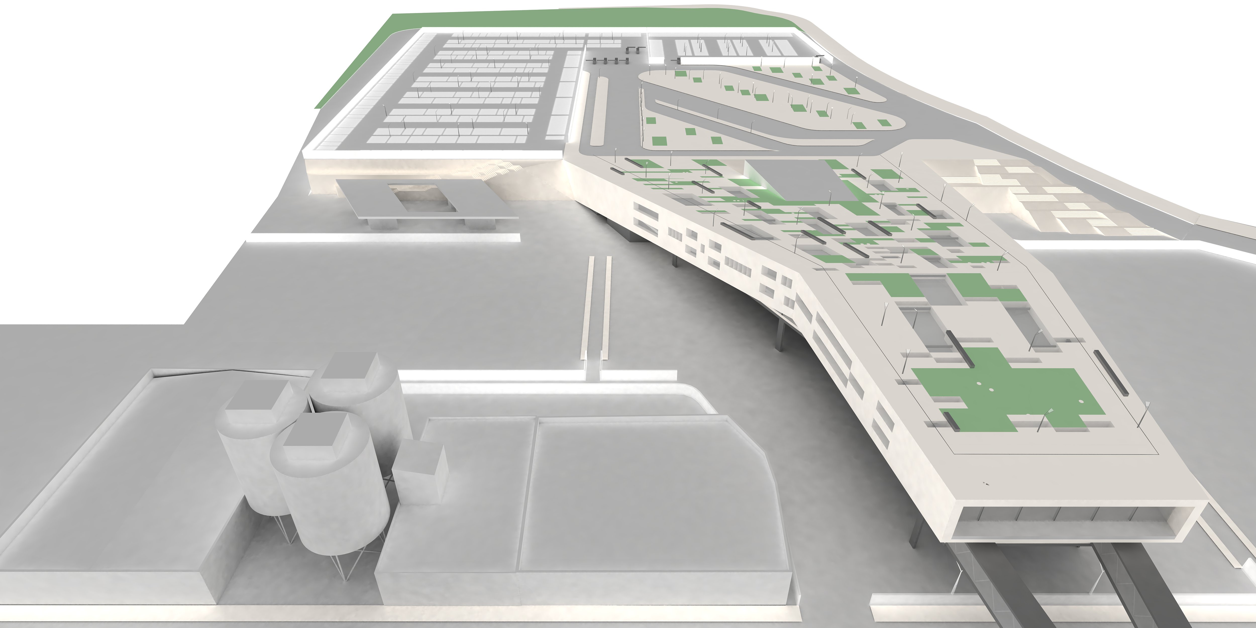 4. Paisajes: En la cuarta categoría se trata de optimizar la integración medioambiental de un complejo que necesariamente consume una cantidad ingente de superficie. Como ya se ha comentado, la estratificación y densificación del programa permite como primera medida reducir significativamente la ‘huella ambiental’ de todo el recinto.