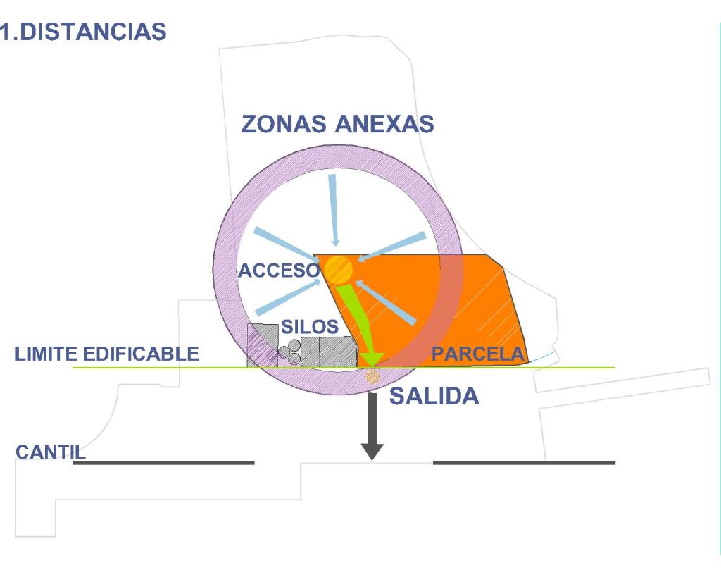 1. Distancias: Desde todas las zonas anexas al edificio de la terminal existe la posibilidad de acceder al mismo en algún momento, la consecuencia inmediata de ello es situar el acceso a la terminal en el lugar edificable más cercano al centro geométrico del ámbito ocupado por las zonas anexas, lo que reducirá los recorridos a pie o en vehículo desde cualquier punto hasta la misma al mínimo posible. Otro de los recorridos a optimizar es el que se realiza desde el acceso principal de la terminal hasta el punto de salida que conduce al buque. Para reducir este recorrido al mínimo se sitúa dicho punto de salida en línea recta hacia el cantil y sobre el límite edificable más cercano al vial principal, esquivando el edificio existente de los silos