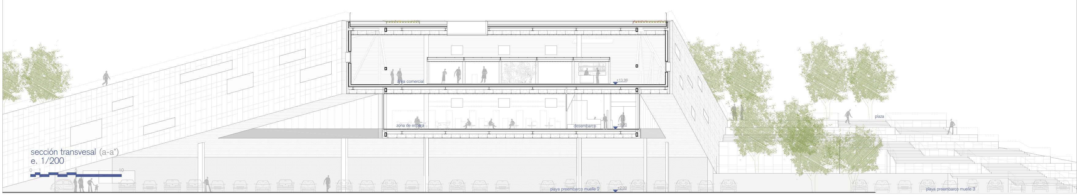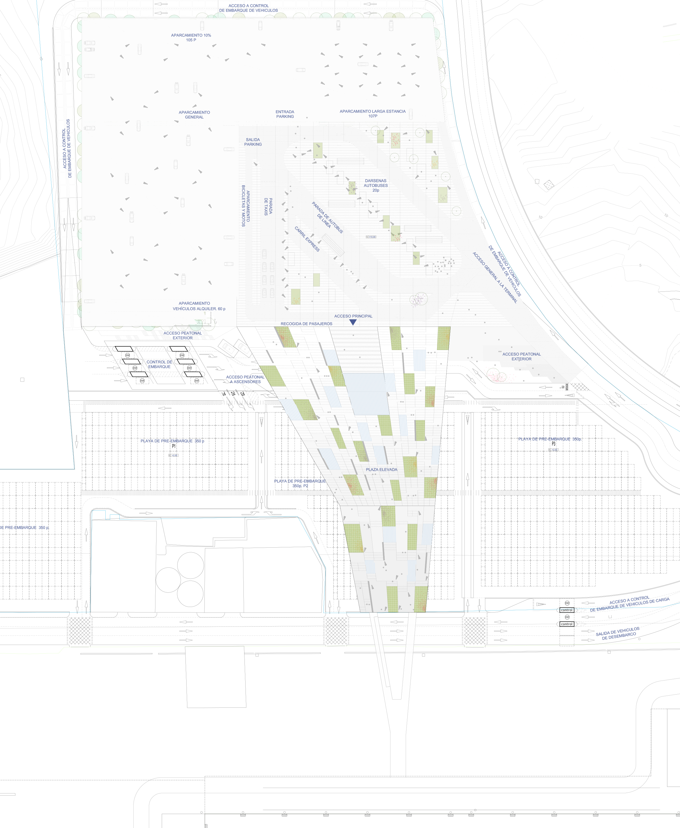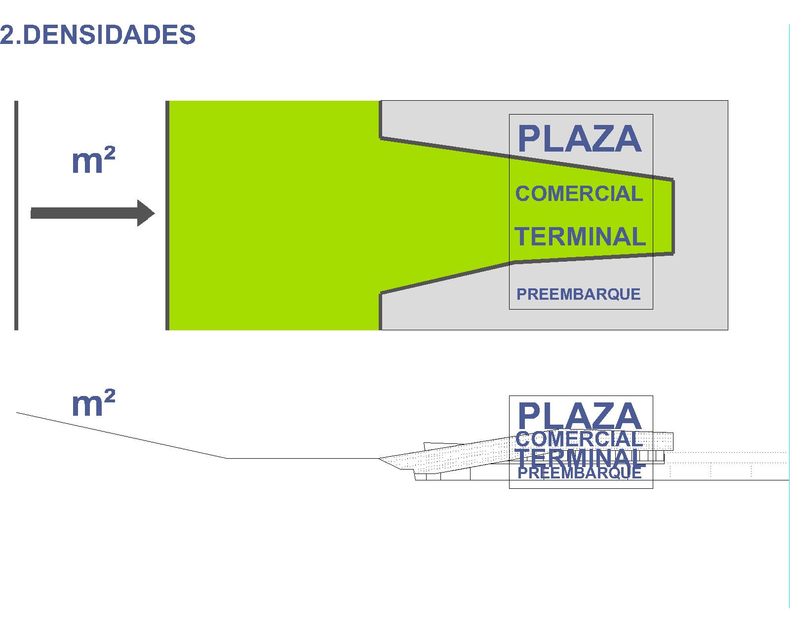 2. Densidades: Partiendo del desnivel existente en la ladera sobre la que se sitúan las parcelas, las zonas anexas se plantean en dos niveles diferenciados: uno a la cota del muelle, y el otro a la cota de acceso de la pasarela que lleva a los buques. Esto permite optimizar el consumo de suelo, permitiendo concentrar en el salto cuatro niveles virtuales (solamente dos construidos) cuya estratificación permite al mismo tiempo: una mayor cercanía de todas las superficies necesarias al muelle, liberar parcela en la parte superior, darle continuidad a la plaza pública de acceso por encima de la terminal, evitar que la parte lúdica del programa no interfiera con los recorridos de facturación y embarque, y permitir que las playas de preembarque de vehículos se puedan situar bajo el edificio más cerca de los accesos directos a las zonas de embarque de cada uno de los muelles, aprovechando la sombra proyectada por éste