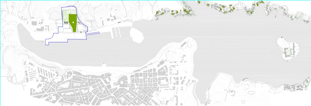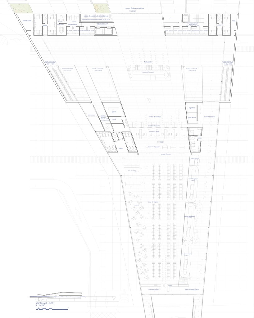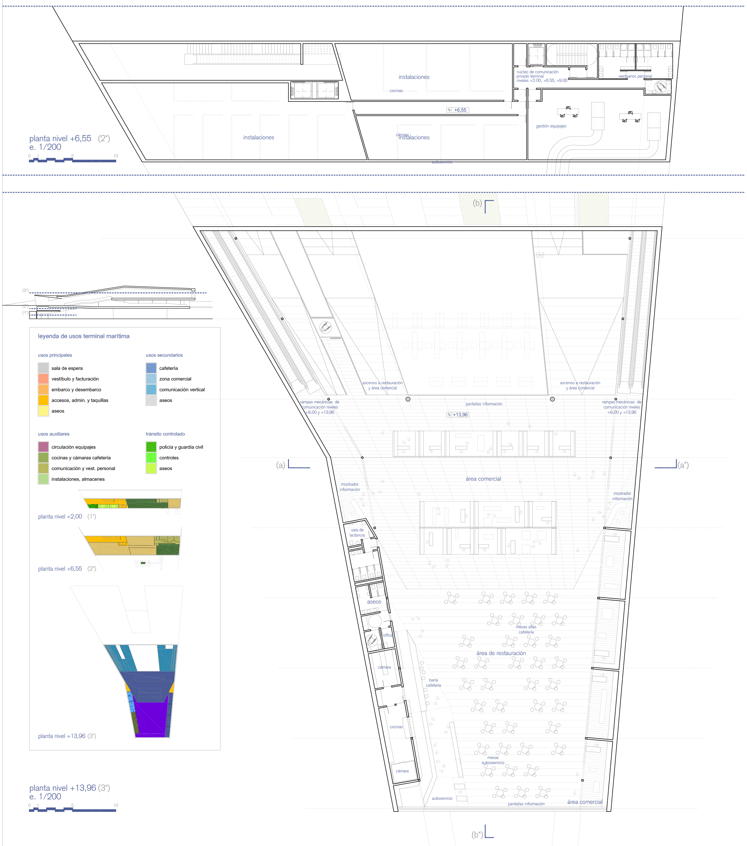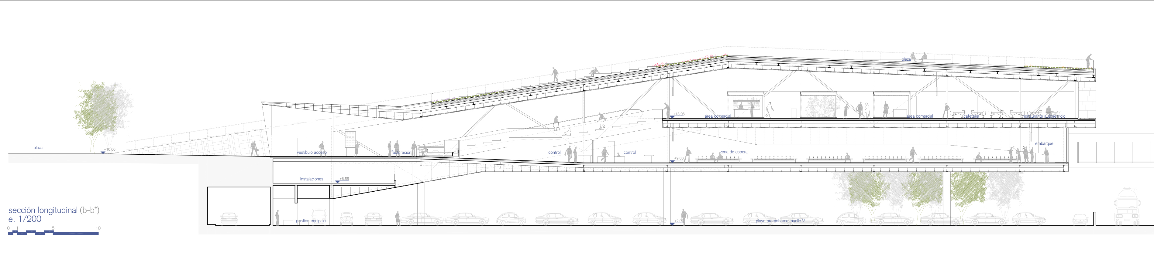 2. Densidades: Partiendo del desnivel existente en la ladera sobre la que se sitúan las parcelas, las zonas anexas se plantean en dos niveles diferenciados: uno a la cota del muelle, y el otro a la cota de acceso de la pasarela que lleva a los buques. Esto permite optimizar el consumo de suelo, permitiendo concentrar en el salto cuatro niveles virtuales (solamente dos construidos) cuya estratificación permite al mismo tiempo: una mayor cercanía de todas las superficies necesarias al muelle, liberar parcela en la parte superior, darle continuidad a la plaza pública de acceso por encima de la terminal, evitar que la parte lúdica del programa no interfiera con los recorridos de facturación y embarque, y permitir que las playas de preembarque de vehículos se puedan situar bajo el edificio más cerca de los accesos directos a las zonas de embarque de cada uno de los muelles, aprovechando la sombra proyectada por éste