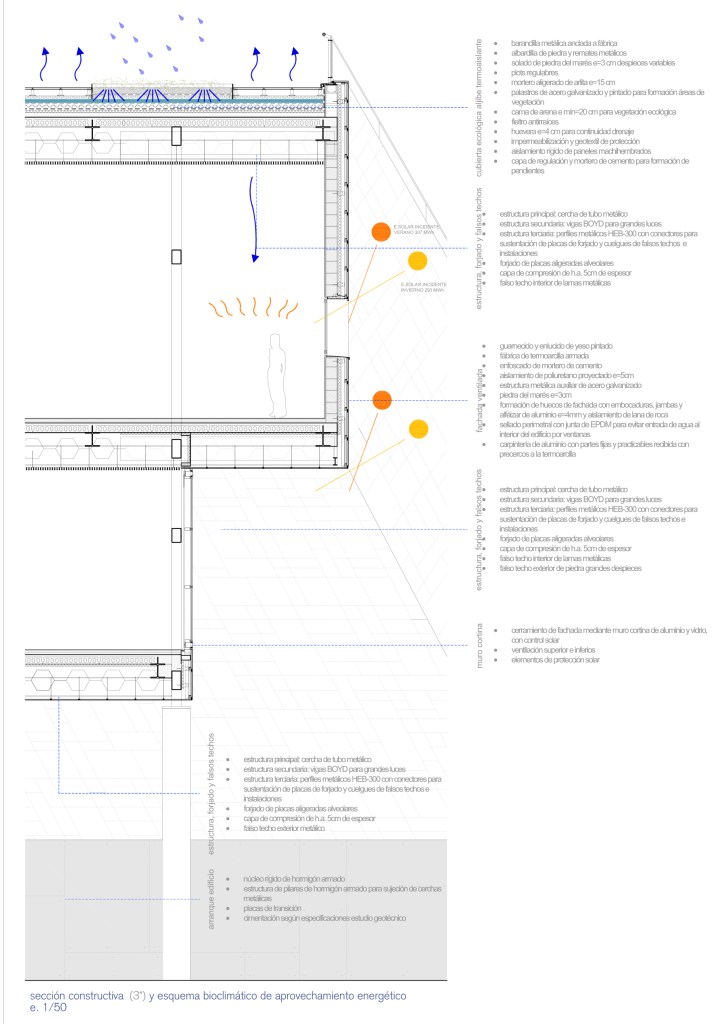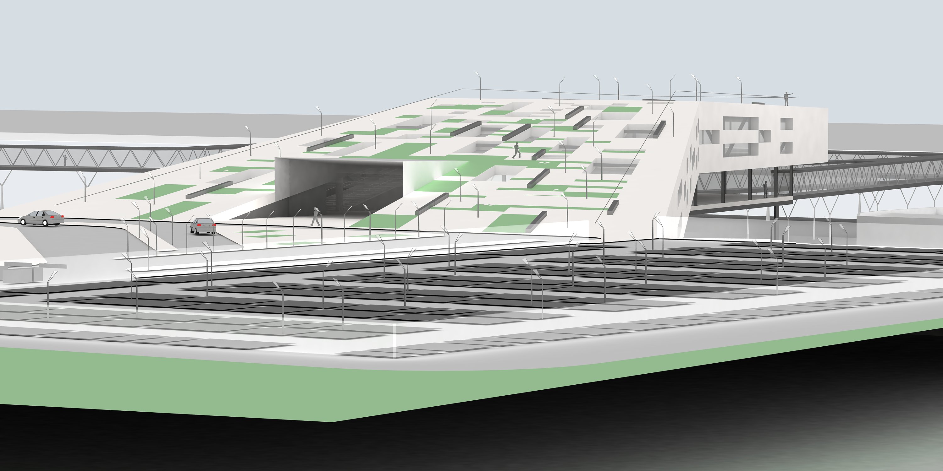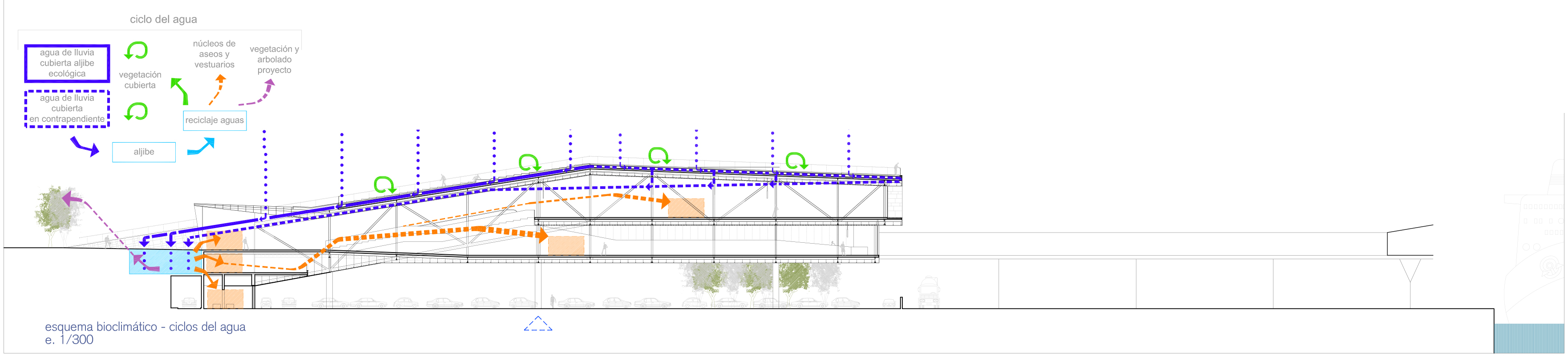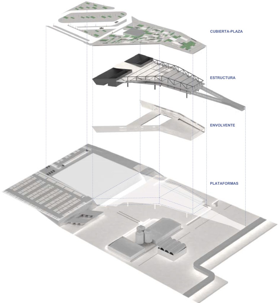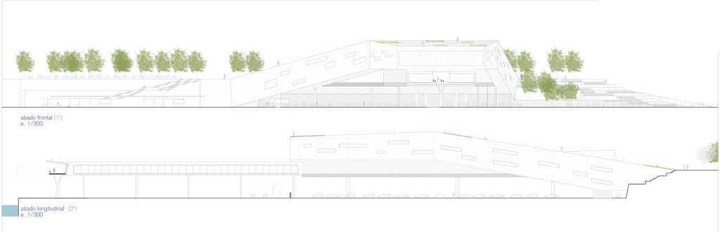 Por tanto, el suelo consumido por las áreas de vehículos menos ‘tratables’ se compensa con el nuevo suelo recuperado al plantear la cubierta de la terminal como prolongación del espacio verde superior, aparte de los beneficios que proporciona en cuanto a estrategias pasivas de eficiencia energética, funcionando como ‘colchón térmico’ y como parte activa en el ciclo de reutilización del agua