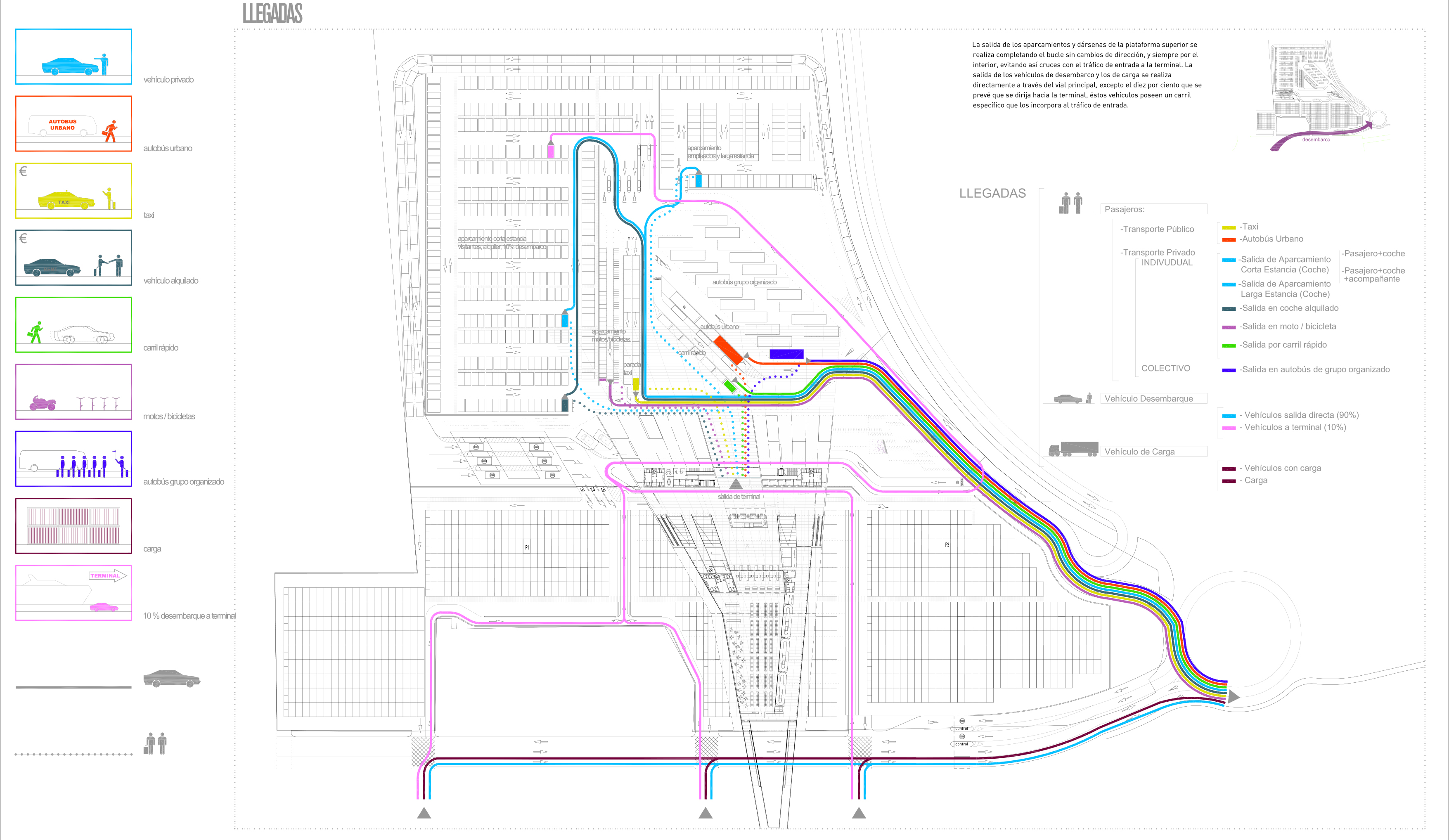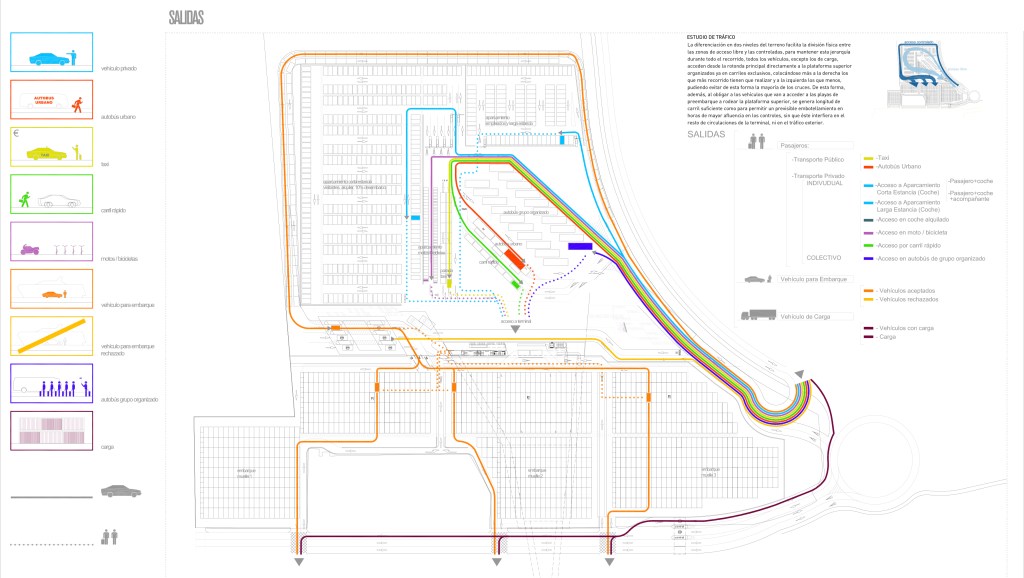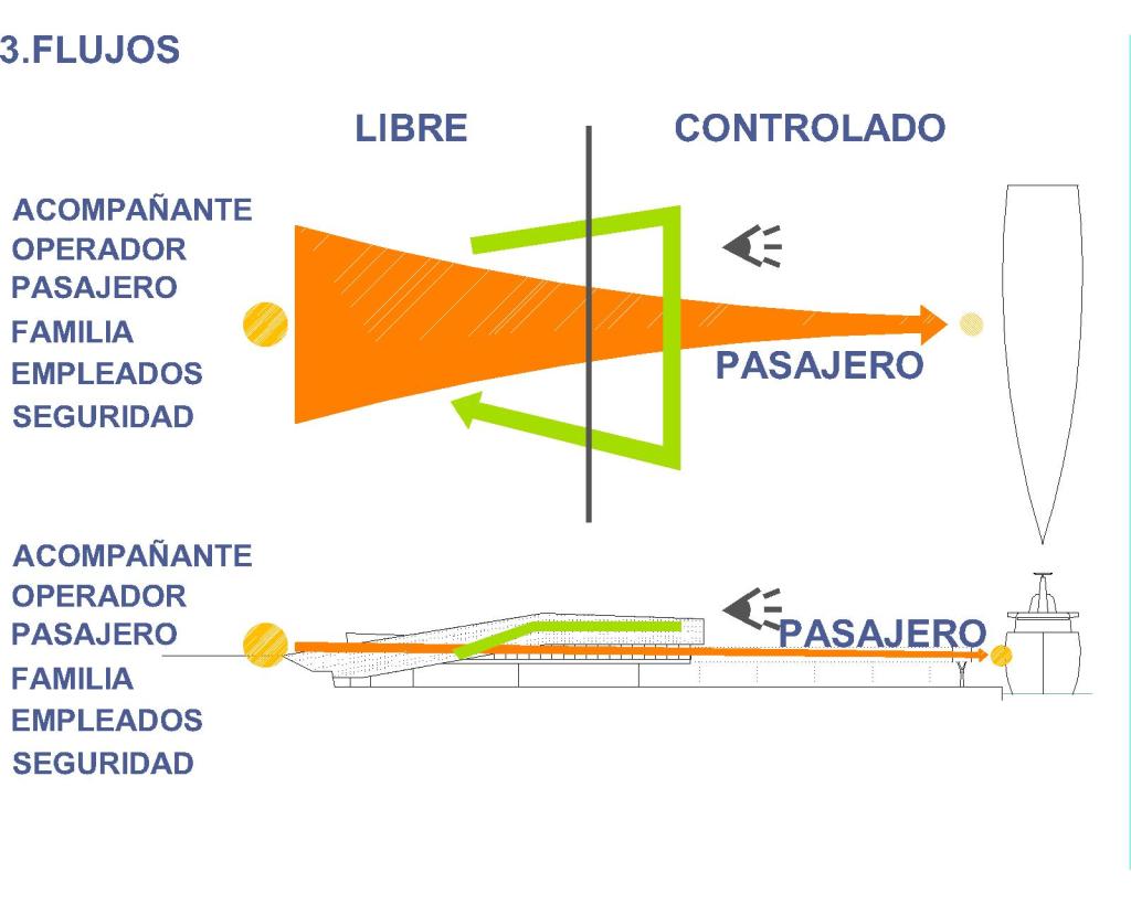 3. Flujos: La estratificación antes mencionada también sirve para optimizar, en cuanto a diferencias de cota a salvar, el recorrido realizado por el pasajero desde el acceso a la terminal hasta el buque, que en caso de apremio, se puede realizar por completo al mismo nivel. Se segregan por tanto dos recorridos básicos: por un lado el funcional, directo, a nivel, y dimensionado espacialmente según el caudal de personas al que debe servir en cada tramo; y por otro el lúdico, en forma de bucle desde el vestíbulo principal, cambiado la cota para no interferir sobre el prioritario y buscando las vistas elevadas sobre la ciudad de Mahón, donde se situará el programa comercial y de restauración