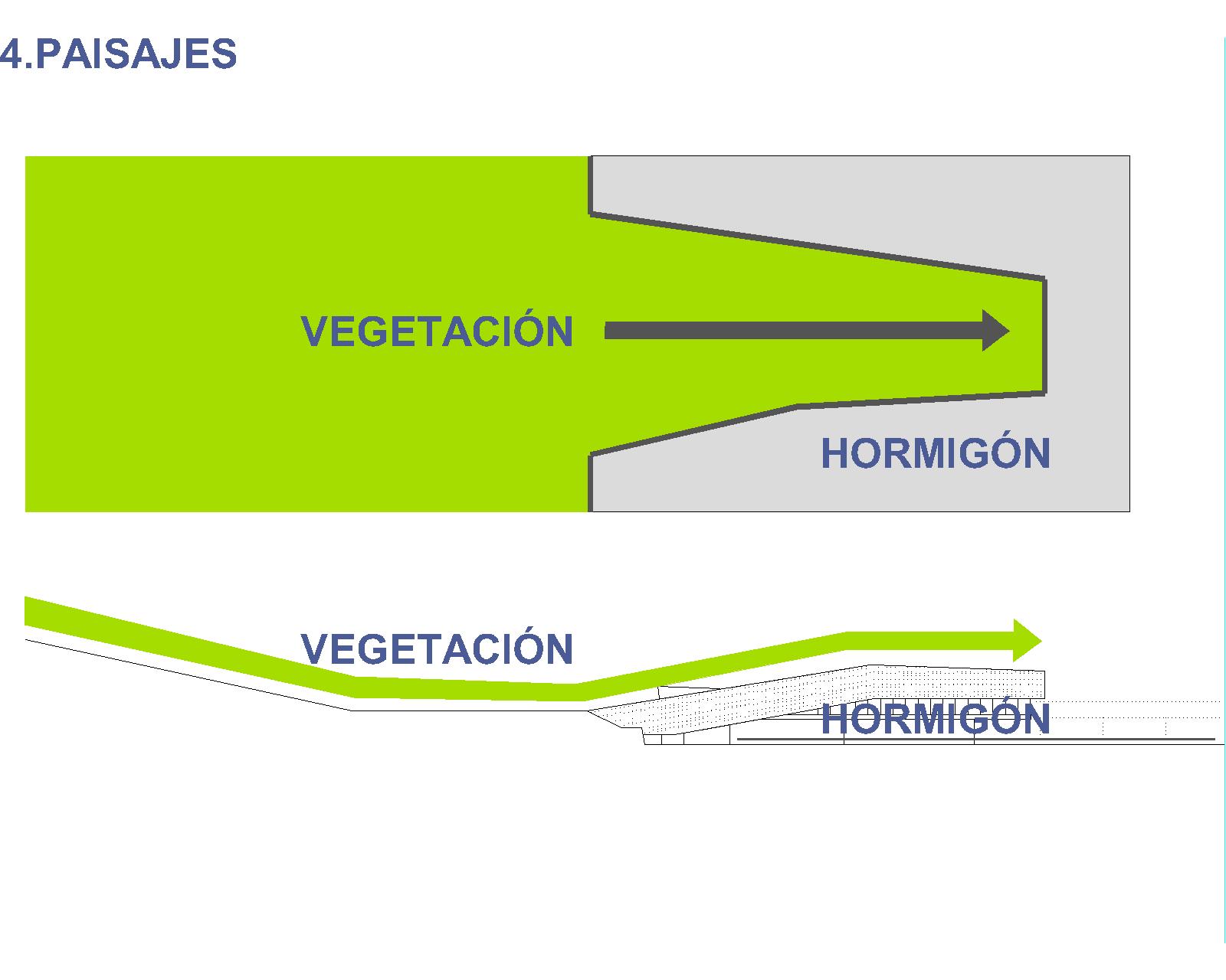 Este desnivel permite a su vez una clara diferenciación entre las zonas anexas destinadas al público general y sin control de acceso, situadas en el nivel superior y las destinadas a vehículos en régimen de pasaje y de acceso restringido, en el inferior. La cualidad paisajística de cada una de ellas es totalmente diferente.
