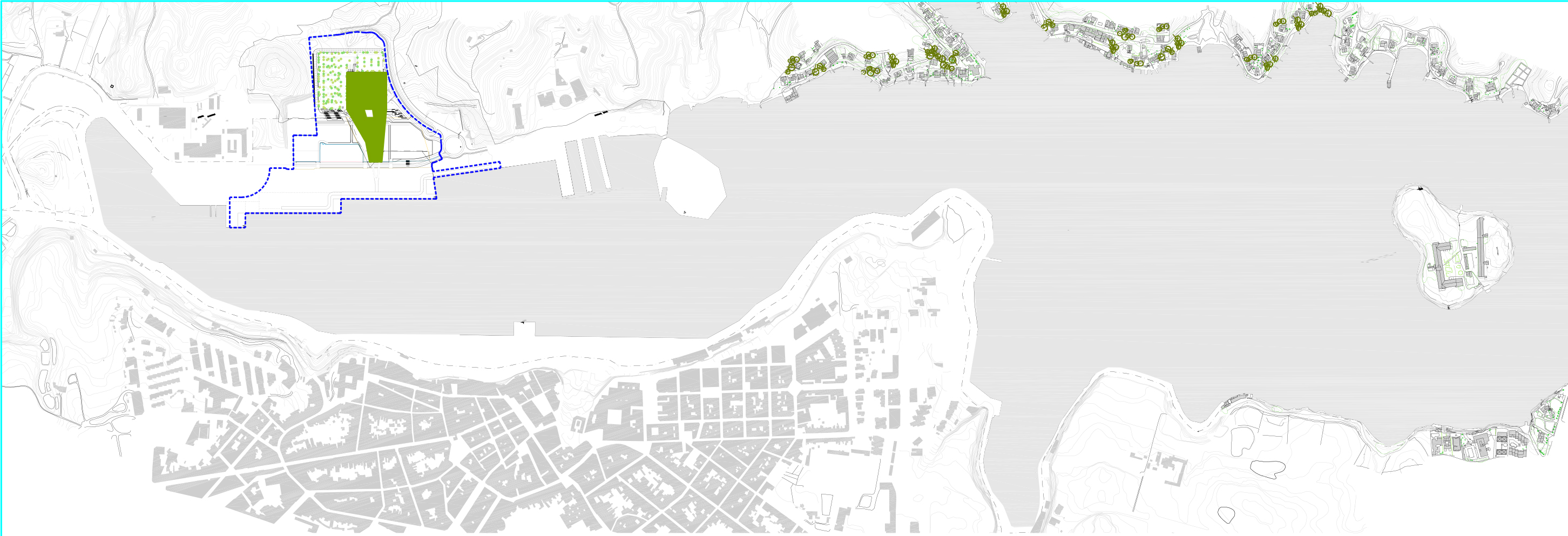 Las zonas destinadas a público permiten un tratamiento más esponjado y libre, con abundante presencia de vegetación en proximidad y como continuación de la ladera, prolongándose por la cubierta del edificio y elevándose para poder disfrutar de una terraza urbana con vistas sobre la ribera de la ciudad, al tiempo que permite ocultar con una ‘alfombra’ verde el nivel inferior de las playas de preembarque que debido a la densidad de coches y la operativa de las maniobras de embarco y desembarco dificultan o, incluso, desaconsejan el introducir elementos para su tratamiento.