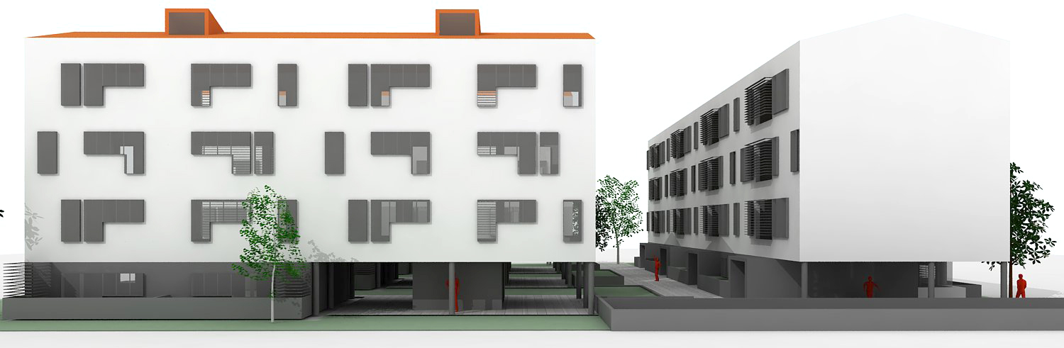 La agrupación de las viviendas se resuelve de manera que el espacio libre ajardinado en planta baja sea el máximo, permitiendo incluso la plantación de árboles de gran porte en algunas zonas de la parcela gracias al trazado de la planta sótano.