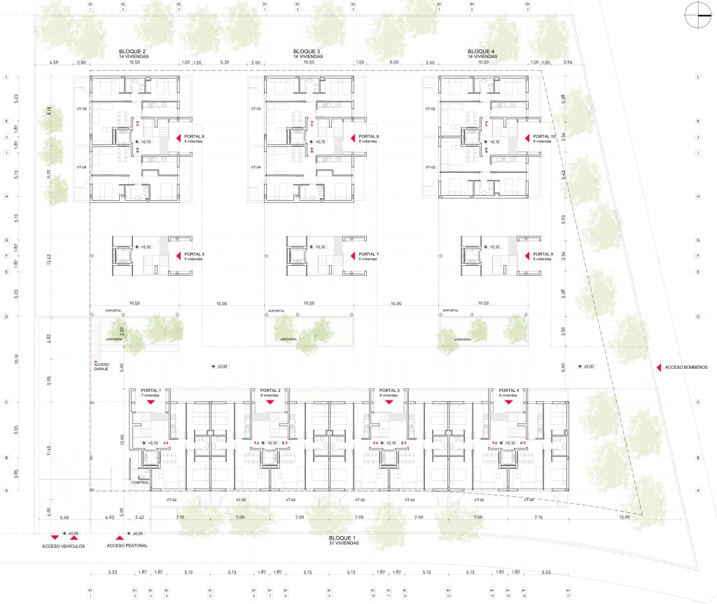 Desde ahí se accede a los distintos portales a través de pasos pavimentados, dejando el resto de espacio libre como zona ajardinada.