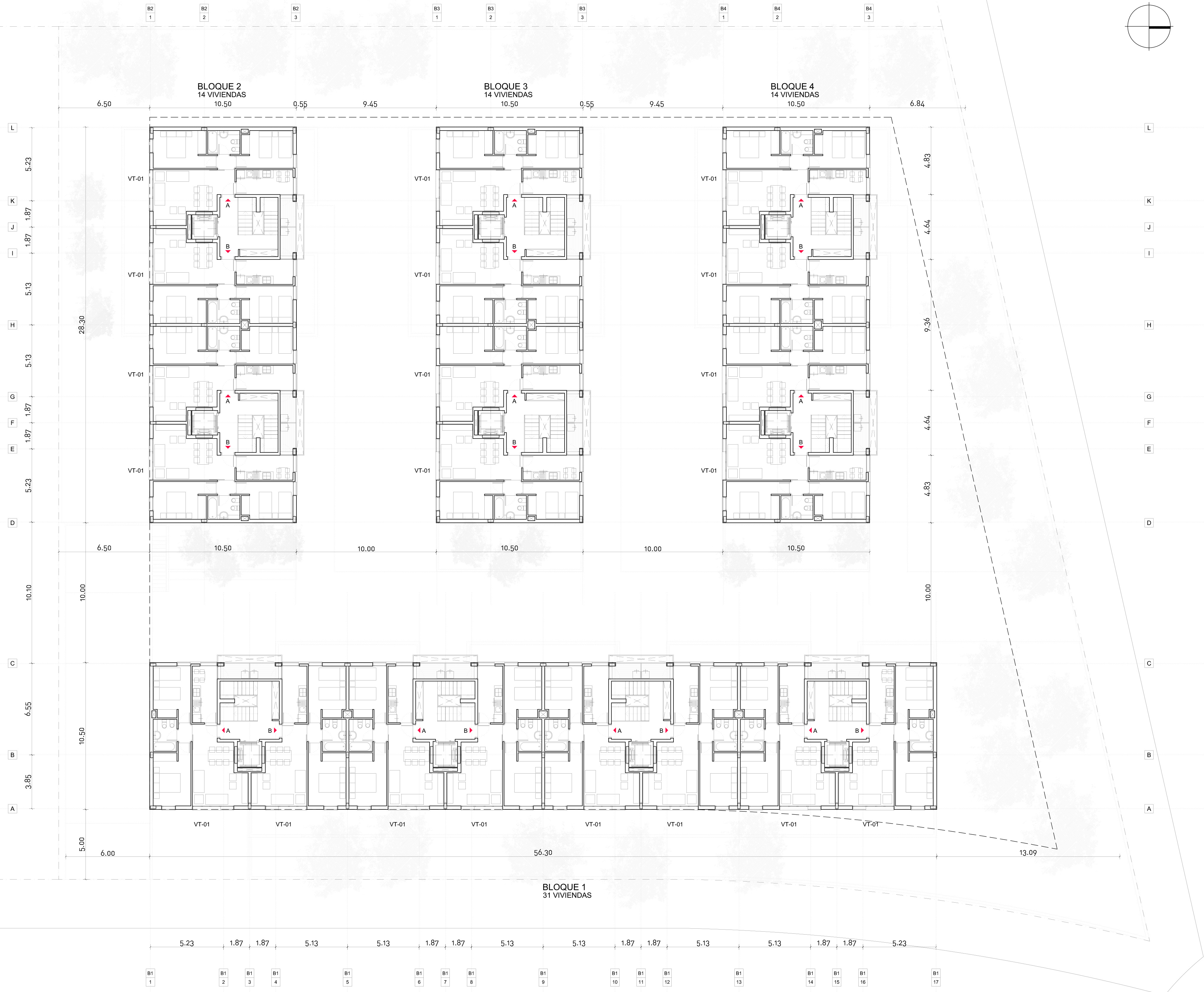 La solución adoptada se compone de cuatro bloques de cuatro alturas (baja + 3).