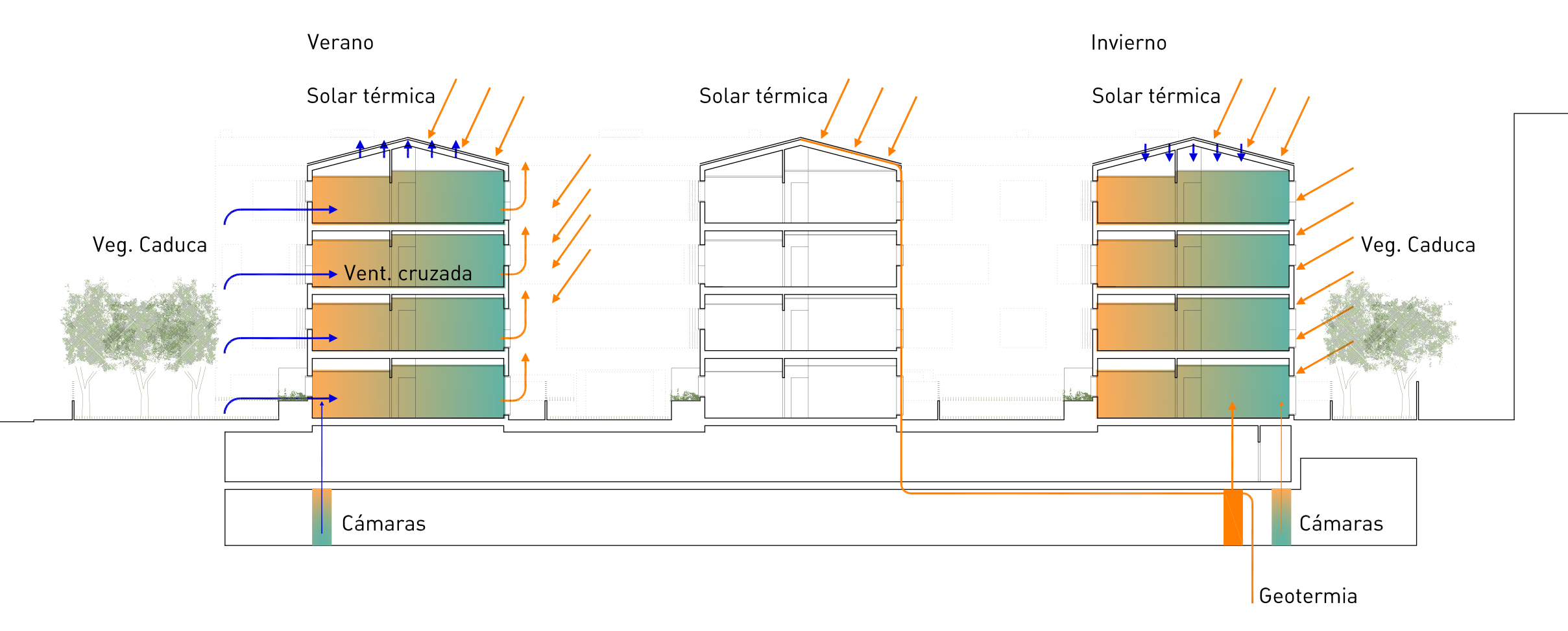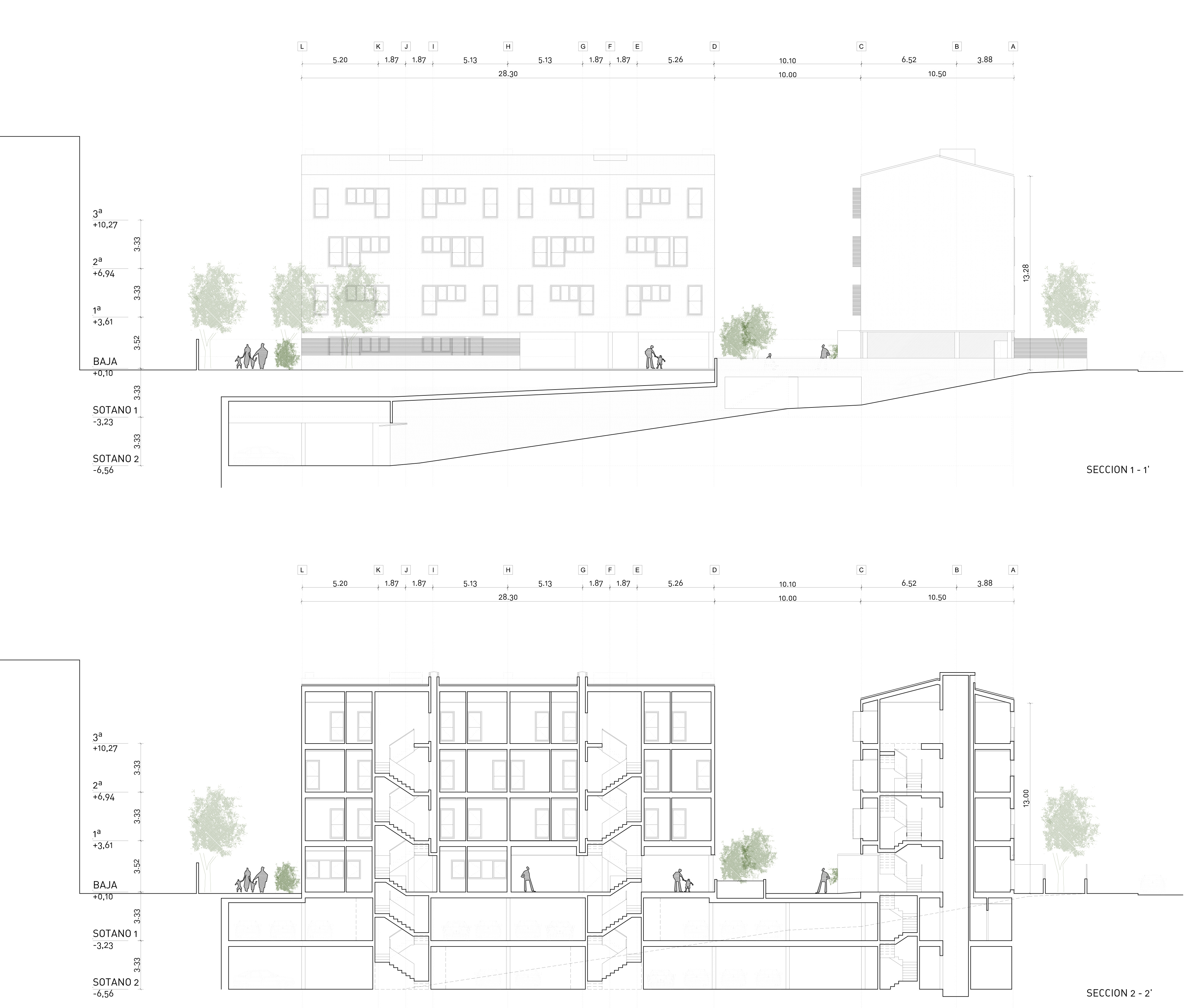 El trazado de la planta sótano permite la plantación de árboles (de hoja caduca) de gran porte dentro de la urbanización lo que proporcionará estancias ajardinadas en sombra en los meses de verano.