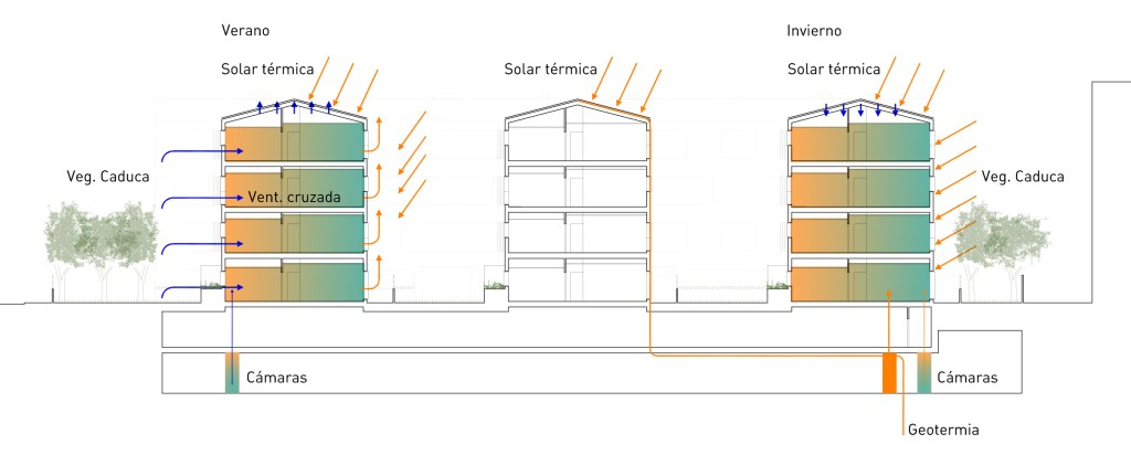 La totalidad de las viviendas tiene ventilación cruzada y orientación norte-sur o este-oeste, lo que garantiza una alta calidad del aire interior de la vivienda, además de una correcta iluminación de las diferentes estancias.