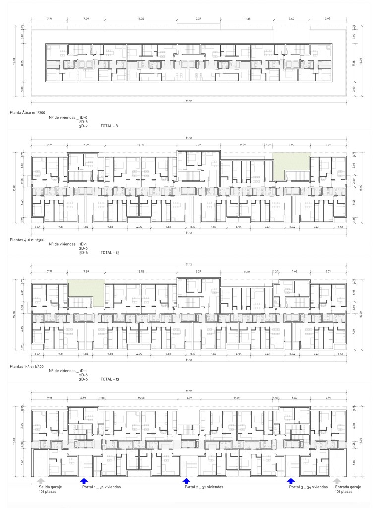 La planta baja se escalona para absorber el desnivel de la parcela, adaptando la misma cota de nivel los tres portales en planta primera. De este modo, ser respeta la altura máxima permitida hasta coronación (24m) proyectando una imagen potente de conjunto, sin escalonamientos.