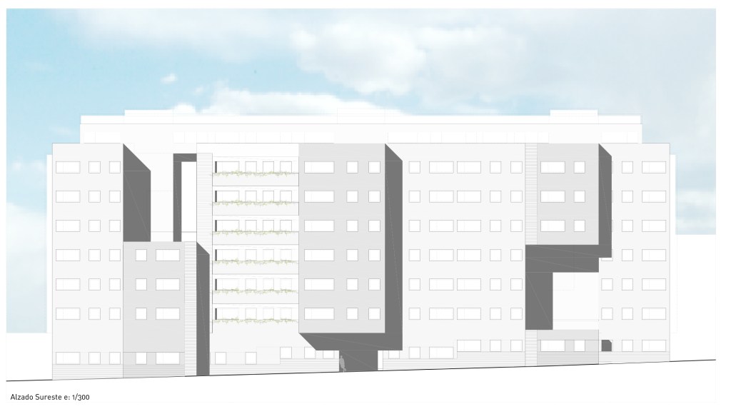 La fachada hacia la zona ajardinada común, se ordena con el mismo tipo de huecos, pero en este caso, el bloque limpio y homogéneo, se mueve, transformándose, en bloques más pequeños que se desplazan hacia el exterior volando sobre la zona ajardinada o desaparecen creando grandes huecos, y haciendo que la fachada sea mucho más permeable.