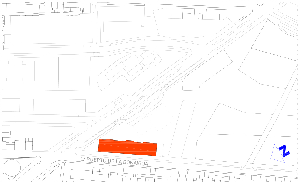 El edificio propuesto ocupa la parcela casi en su totalidad, respetando la obligación de alineamiento a la calle Puerto de la Bonaigua. El acceso a los tres portales y a garaje se produce por esta calle, ya que el resto del perímetro del edificio es zona verde básica.