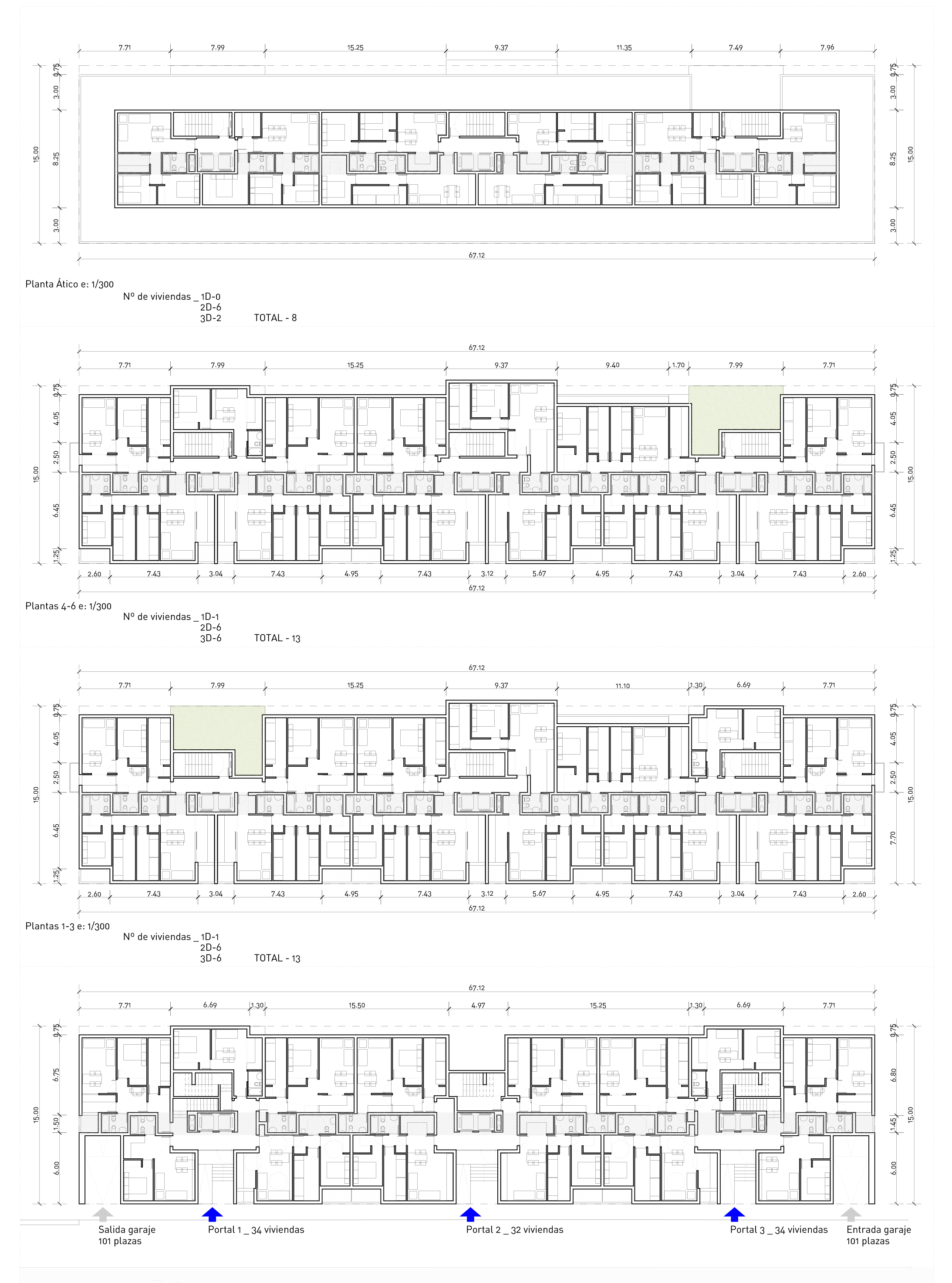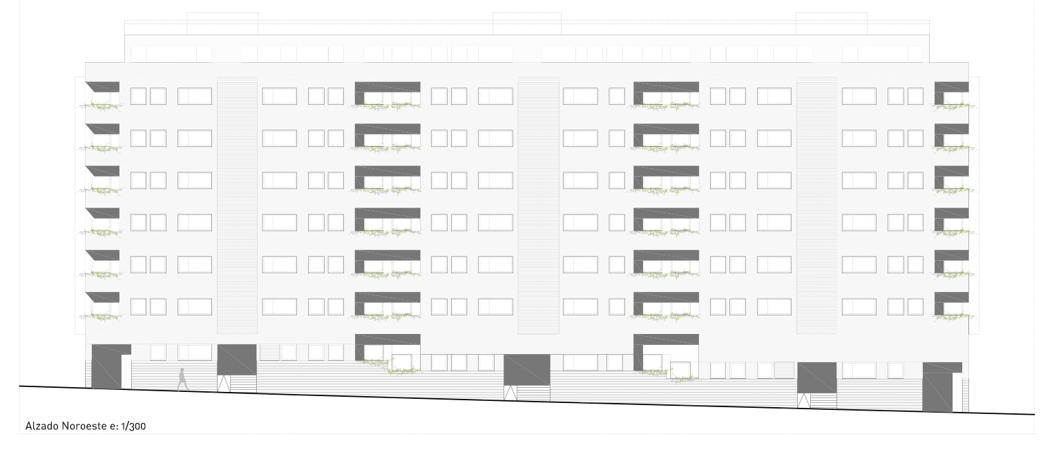 La planta baja se escalona para absorber el desnivel de la parcela, adaptando la misma cota de nivel los tres portales en planta primera. De este modo, ser respeta la altura máxima permitida hasta coronación (24m) proyectando una imagen potente de conjunto, sin escalonamientos.