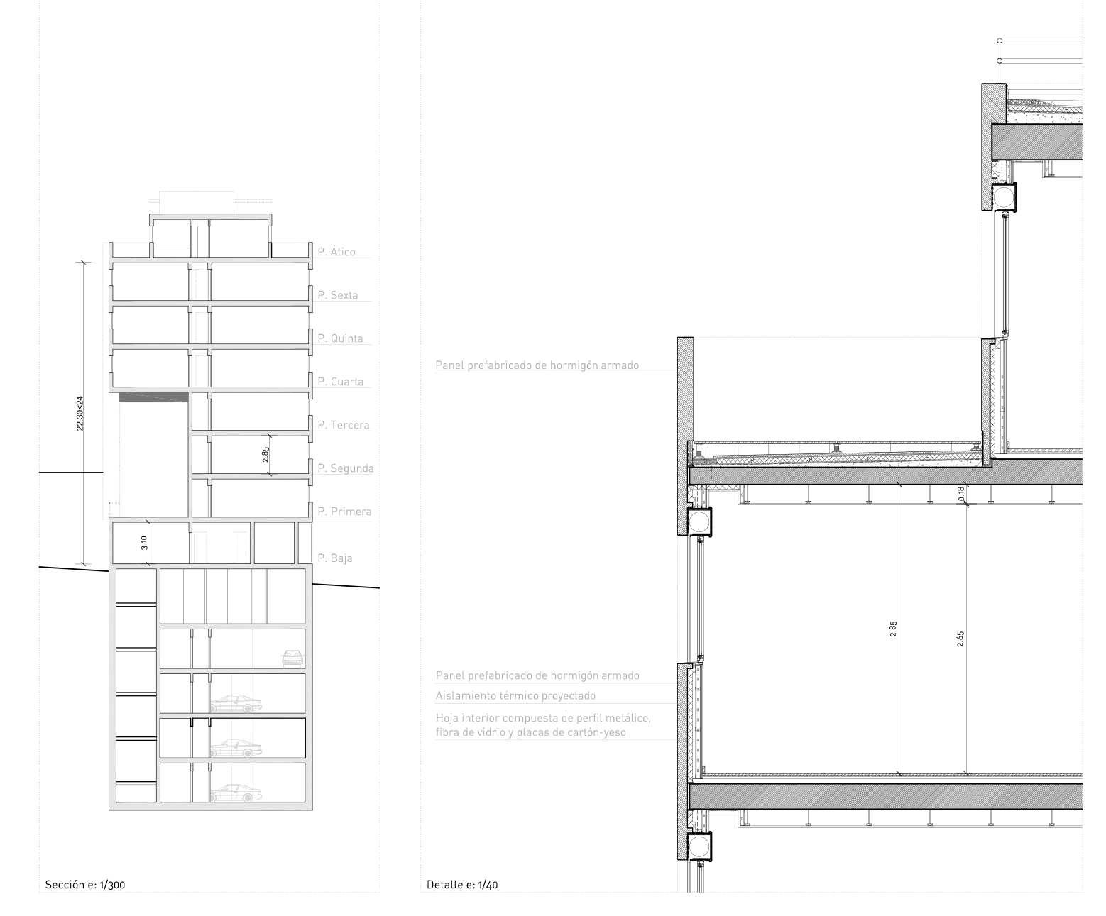 Hacia el exterior la fachada se compone de grandes paneles prefabricados de hormigón armado. Estas piezas van trasdosadas con aislamiento térmico proyectado, una cámara de aire y tabiques con doble placa de cartón-yeso de 13 mm montados sobre guías metálica.