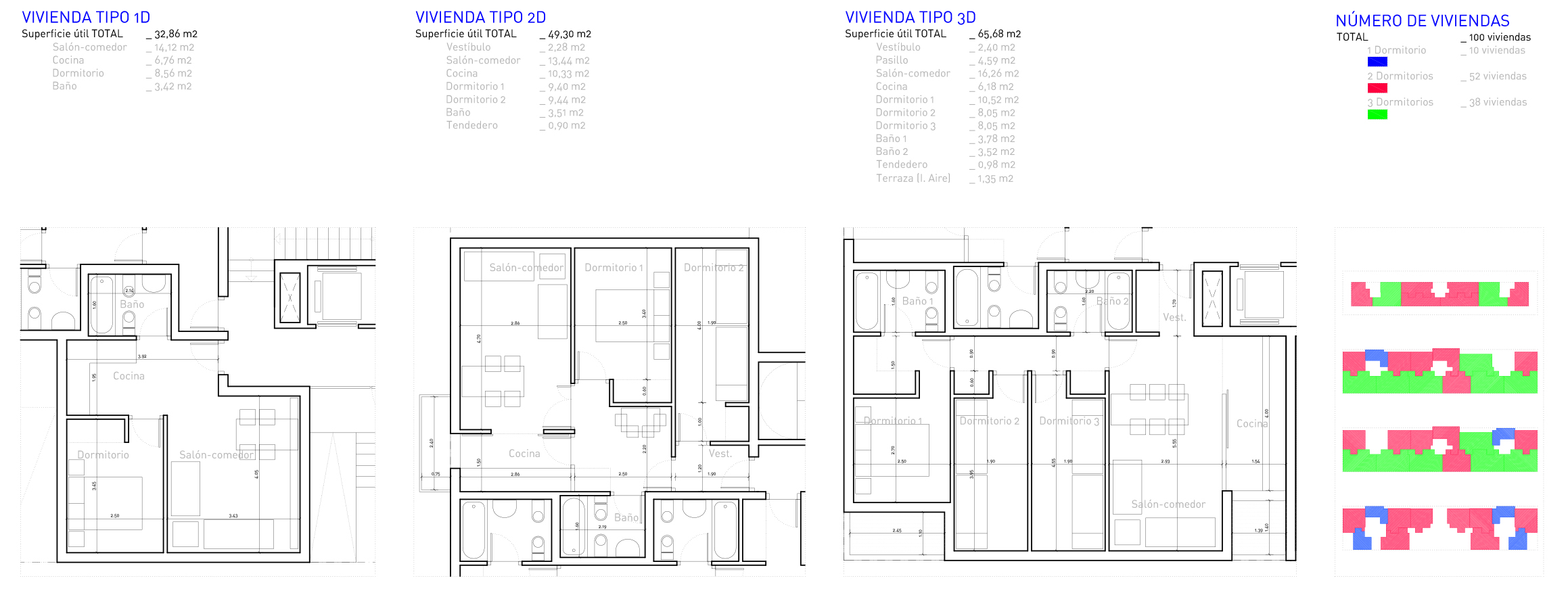 La solución propuesta consiste en un bloque aislado, en el que se resuelven 100 viviendas de 1, 2 y tres dormitorios, con trasteros y plazas de garaje. Las comunicaciones verticales del conjunto se resuelven en tres núcleos de comunicación.