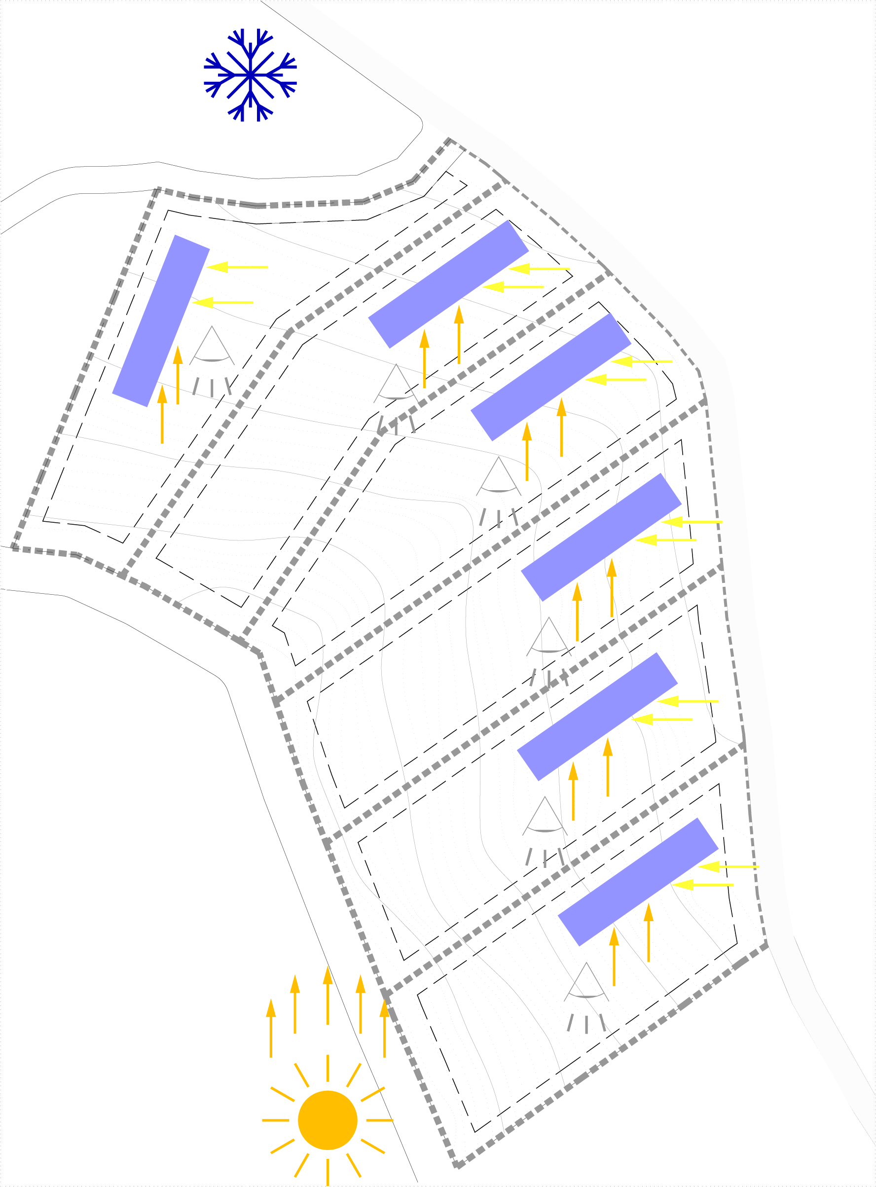La pendiente tiene una cualidad más, que es la de condicionar fuertemente el abanico de orientaciones posible. Aunque una de las características de la Sierra de Madrid es que tiene una ladera orientada hacia el Sur de forma natural lo que hace que vistas y soleamiento coincidan, en nuestro caso, la mayor parte de la parcela está orientada hacia el Suroeste, de modo que si buscásemos una posición en paralelo a las curvas de nivel enfocaríamos en gran medida la fachada principal de la vivienda hacia una de las peores orientaciones en la Comunidad de Madrid en el verano, el Oeste y ofreciendo una gran cantidad de fachada hacia el Nordeste, una orientación muy desfavorable para el invierno.