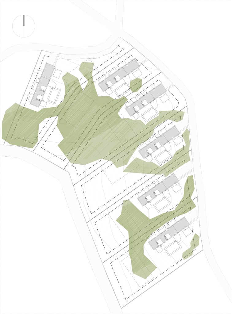 La forma natural de evitar ese conflicto sería buscar dicho desarrollo en paralelo a las curvas de nivel pero, la necesidad de dividir la parcela original en seis sub-parcelas diferentes con la obligación normativa de que no sean inferiores a 2.000 m2 y el acceso obligado desde la calle Reina Victoria hacen que las parcelas resultantes (todas de idéntica superficie de 2045 m2) tengan su mayor desarrollo en la misma dirección que la pendiente, quedando un ancho de parcela demasiado justo como para lograr la necesaria intimidad entre vecinos si la vivienda se desarrollara en paralelo a la pendiente, aunque con una media de 20 metros que es más que suficiente en la disposición a favor de la pendiente.