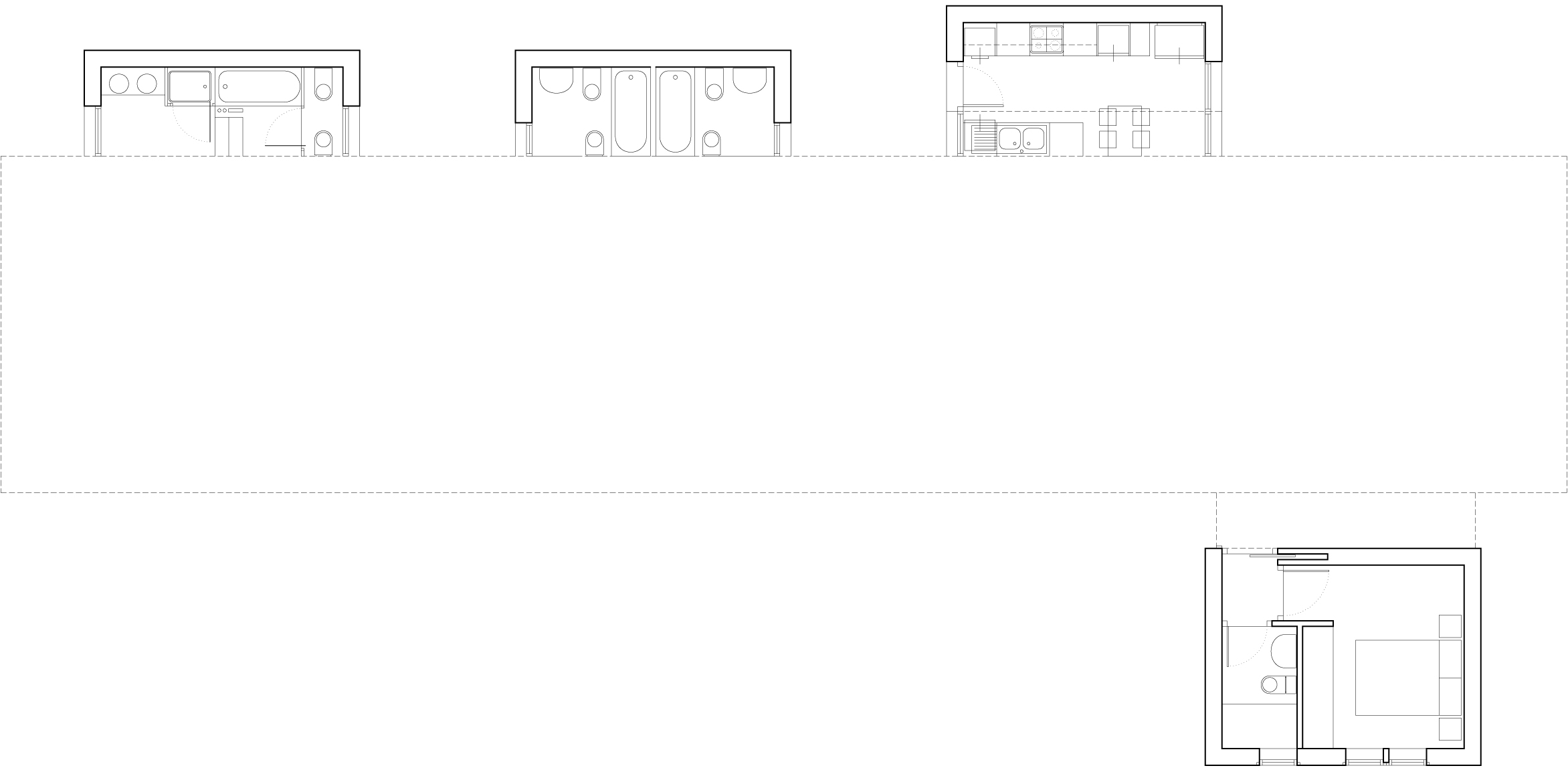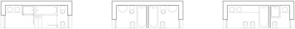 Los baños, al estar realizados sobre la misma base estructural permiten la configuración de doble baño completo para los dormitorios o baño principal “en suite” para el dormitorio principal, o baño “en suite” más aseo para invitados y tercer dormitorio sin necesidad de realizar cambios en proyecto, más que los referentes a las instalaciones que los sirven.