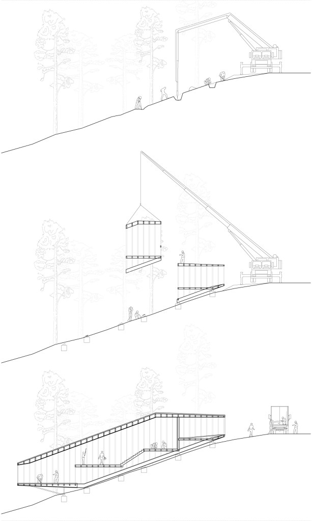 La propuesta contiene cualidades suficientes como para poder ser considerada, si así se desea y se desarrolla en la fase de proyecto, como una construcción de carácter sostenible. Es una de las consecuencias derivadas de la decisión elección del tipo estructural y de reducir al mínimo indispensable la intervención sobre un terreno especialmente delicado y rico en diversidad natural como es el entorno de la Sierra y evitando de esta manera alterar tanto la vegetación existente (en la medida de lo posible, ya que habría parcelas en las que sería inevitable) como la escorrentía de la ladera, evitando de esta manera también problemas derivados de la excavación en laderas tales como inundaciones. El alto grado de industrialización de la construcción permite también reducir la contaminación de la obra derivada de los escombros generados por la elaboración de materiales en el lugar así como la capacidad de minimizar el consumo de energía tanto para la construcción (mucho más eficaz la elaboración en taller) como del transporte a la obra. La opción de construir la totalidad de la estructura con maderas certificadas y el uso de materiales reciclados, así como la posibilidad de reciclaje total de la construcción al utilizar técnicas de ensamblaje “en seco” unidas a la utilización de energías alternativas (facilidad de integración de paneles solares en cubierta gracias a su orientación e inclinación) también colaboran a la posibilidad de alcanzar incluso, estándares de construcción sostenible como los de “casa pasiva” o las certificaciones Leed, Breeam o la española Verde.