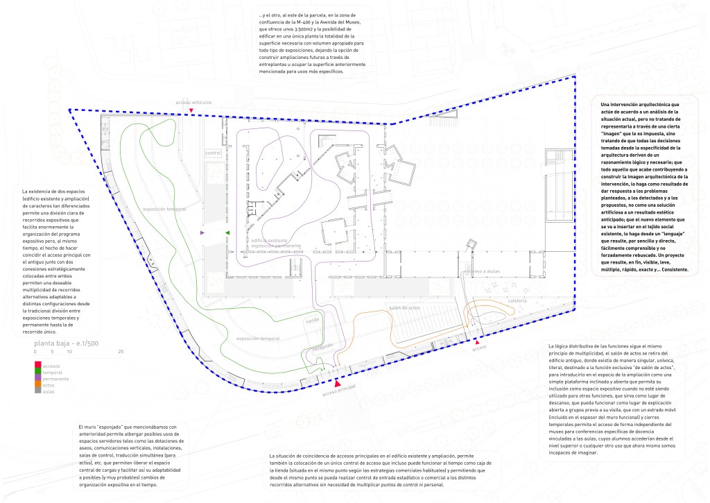 La existencia de dos espacios (edificio existente y ampliación) de caracteres tan diferenciados permite una división clara de recorridos expositivos que facilita enormemente la organización del programa expositivo pero, al mismo tiempo, el hecho de hacer coincidir el acceso principal con el antiguo junto con dos conexiones estratégicamente colocadas entre ambos permiten una deseable multiplicidad de recorridos alternativos adaptables a distintas configuraciones desde la tradicional división entre exposiciones temporales y permanente hasta la de recorrido único. La situación de coincidencia de accesos principales en el edificio existente y ampliación, permite también la colocación de un único control de acceso que incluso puede funcionar al tiempo como caja de la tienda (situada en el mismo punto según las estrategias comerciales habituales) y permitiendo que desde el mismo punto se pueda realizar control de entrada estadístico o comercial a los distintos recorridos alternativos sin necesidad de multiplicar puntos de control ni personal.
