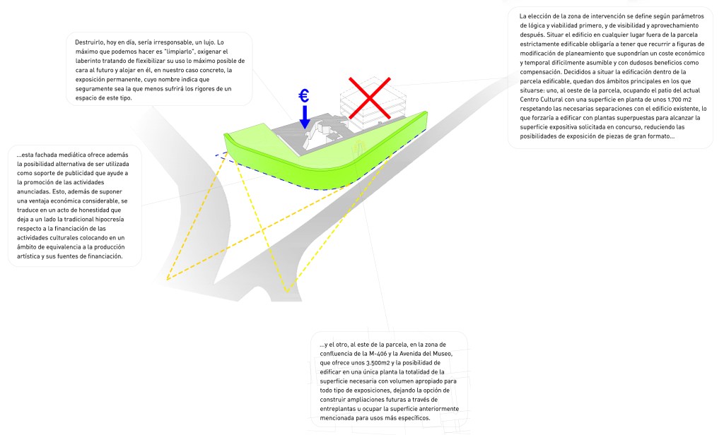 La elección de la zona de intervención se define según parámetros de lógica y viabilidad primero, y de visibilidad y aprovechamiento después. Situar el edificio en cualquier lugar fuera de la parcela estrictamente edificable obligaría a tener que recurrir a figuras de modificación de planeamiento que supondrían un coste económico y temporal difícilmente asumible y con dudosos beneficios como compensación. Decididos a situar la edificación dentro de la parcela edificable, quedan dos ámbitos principales en los que situarse: uno, al oeste de la parcela, ocupando el patio del actual Centro Cultural con una superficie en planta de unos 1.700 m2 respetando las necesarias separaciones con el edificio existente, lo que forzaría a edificar con plantas superpuestas para alcanzar la superficie expositiva solicitada en concurso, reduciendo las posibilidades de exposición de piezas de gran formato; y el otro, al este de la parcela, en la zona de confluencia de la M-406 y la Avenida del Museo, que ofrece unos 3.500m2 y la posibilidad de edificar en una única planta la totalidad de la superficie necesaria con volumen apropiado para todo tipo de exposiciones, dejando la opción de construir ampliaciones futuras a través de entreplantas u ocupar la superficie anteriormente mencionada para usos más específicos. Esta zona tiene la ventaja además de ofrecer más del 50% de la nueva superficie de fachada (que envuelve y sustituye la del antiguo edificio) a las vías de acceso a la ciudad, proporcionando la visibilidad física deseada.
