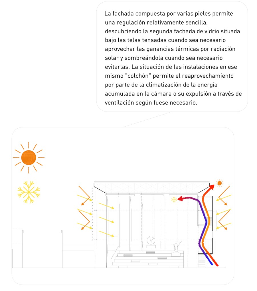 La precisión alcanza también aspectos que van más allá de lo estrictamente dimensional, los intercambios de energía con el entorno han de ser controlados con precisión y corregidos con agilidad. La doble piel ligera y modificable, unida a la posibilidad de introducir vegetación de hoja caduca en las zonas del muro de fachada que estén libres de tela tensada, permite que todo el muro de la fachada principal funcione como un gran regulador térmico. La orientación de la fachada principal recoge las primeras horas del recorrido solar, mientras que la fachada que se sitúa frente al actual Centro Cultural de las Dehesillas, más abierta y delgada y, por lo tanto, menos controlable, se encuentra protegida por lamas en la parte superior y por el propio edificio del Centro Cultural en la inferior. La fachada compuesta por varias pieles permite una regulación relativamente sencilla, descubriendo la segunda fachada de vidrio situada bajo las telas tensadas cuando sea necesario aprovechar las ganancias térmicas por radiación solar y sombreándola cuando sea necesario evitarlas. La situación de las instalaciones en ese mismo “colchón” permite el reaprovechamiento por parte de la climatización de la energía acumulada en la cámara o su expulsión a través de ventilación según fuese necesario. La vegetación de hoja caduca situada en las zonas abiertas de la fachada realizaría una función similar a la de las telas tensadas móviles, permitiendo las ganancias térmicas en invierno y sombreando en verano.