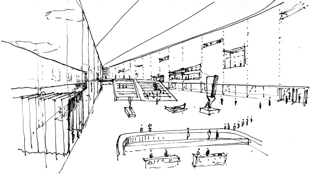 El muro “esponjado” que mencionábamos con anterioridad permite albergar posibles usos de espacios servidores tales como las dotaciones de aseos, comunicaciones verticales, instalaciones, salas de control, traducción simultánea (para actos), etc. que permiten liberar el espacio central de cargas y facilitar así su adaptabilidad a posibles (y muy probables) cambios de organización expositiva en el tiempo. Se libera también de dichas cargas al antiguo edificio, de manera que eliminando su actual compartimentación sea capaz de incrementar su flexibilidad en ese mismo sentido.