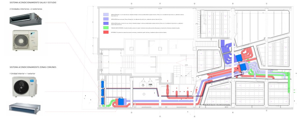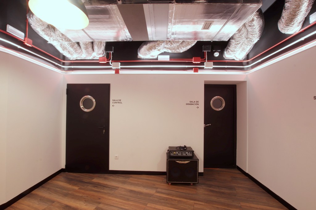 espacio público, pasando por el filtro de la recepción y un espacio previo de espera, a un espacio de carácter semipúblico en el interior configurado como una plaza, que hace las veces de distribuidor a los distintos locales así como de espacio de descanso y relación entre actuaciones, terminando en la privacidad y aislamiento sensorial del interior de las salas de ensayo. La configuración formal de este tránsito utiliza las geometrías quebradas y la textura rugosa de las paredes para generar un laberinto acústico, similar al que se utiliza en el interior de las cajas de líneas de transmisión (altavoces) para modular la onda posterior, del
