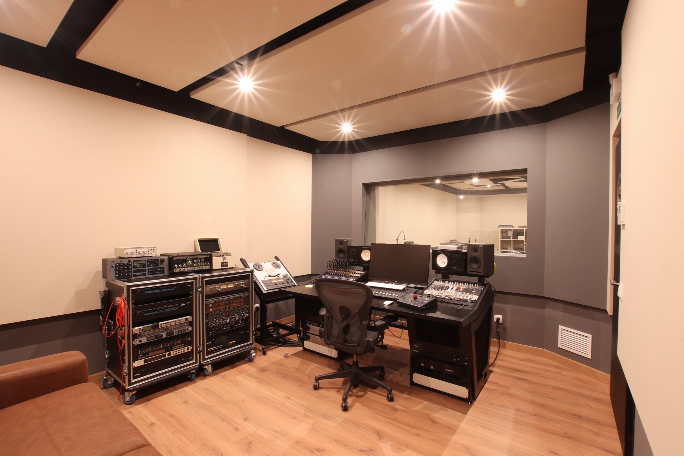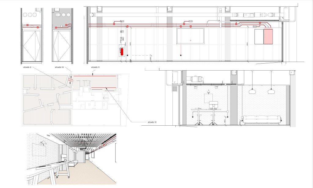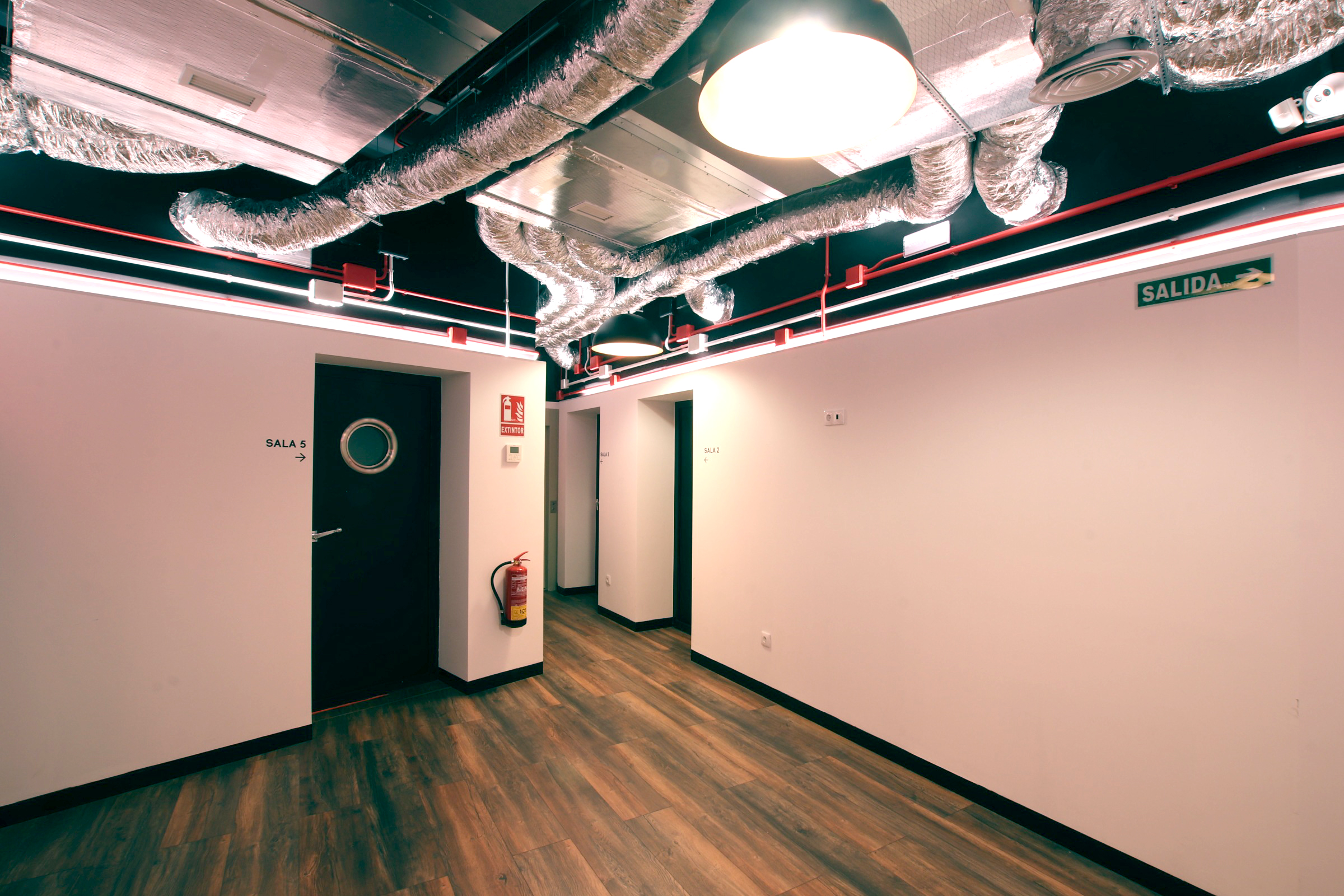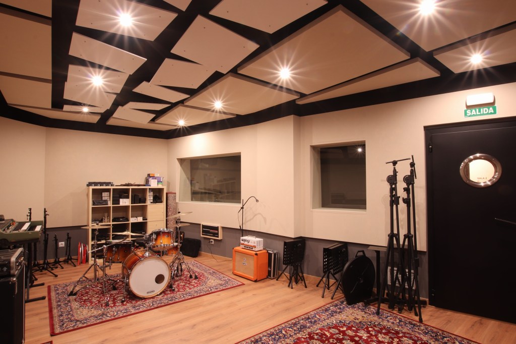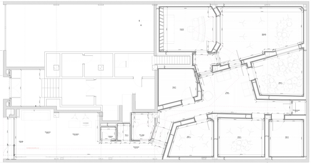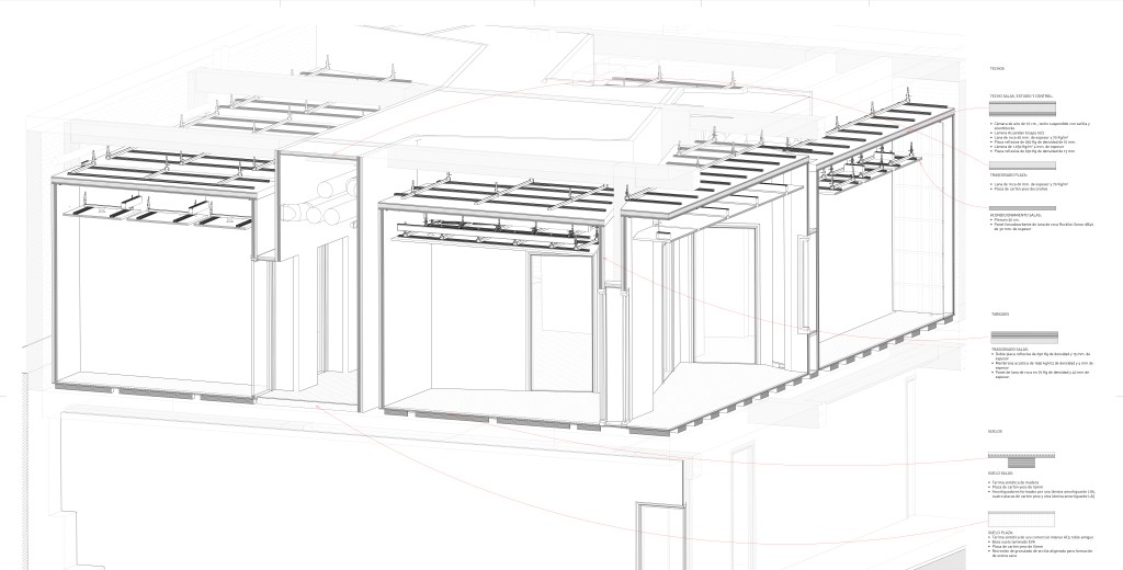 Esa misma geometría sirve también para evitar, de una forma sencilla, el paralelismo entre los cerramientos de las salas y favorecer así el acondicionamiento acústico en su interior, también facilita la adaptación natural a las distintas irregularidades introducidas por los pilares, tuberías, descuelgues de vigas y recrecidos presentes en el local.