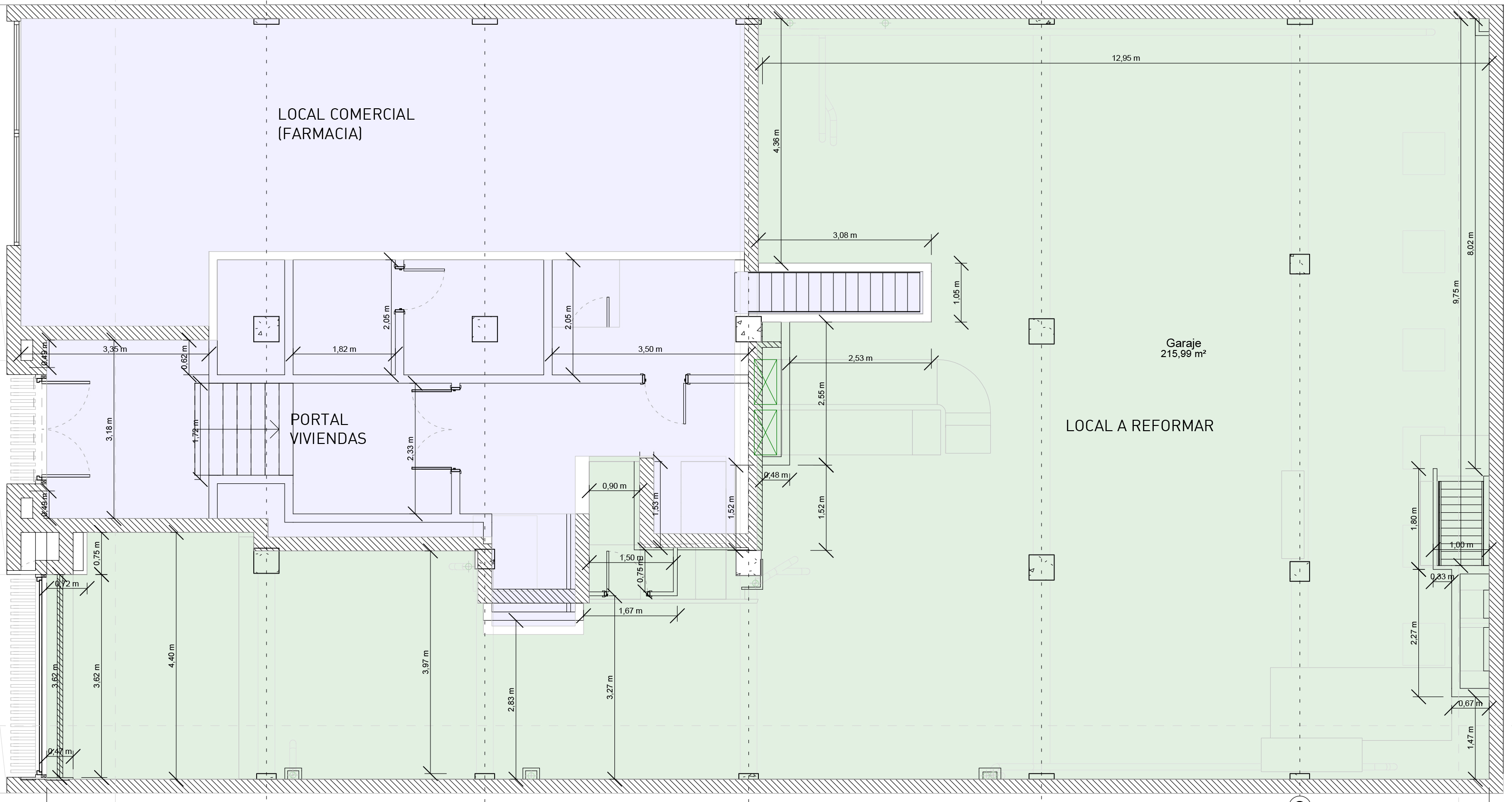 El encargo consiste en adaptar el garaje existente para ser utilizado como escuela de música y locales de ensayo. Frente a la configuración convencional en ‘peine’ en la que se accede a las distintas salas a través